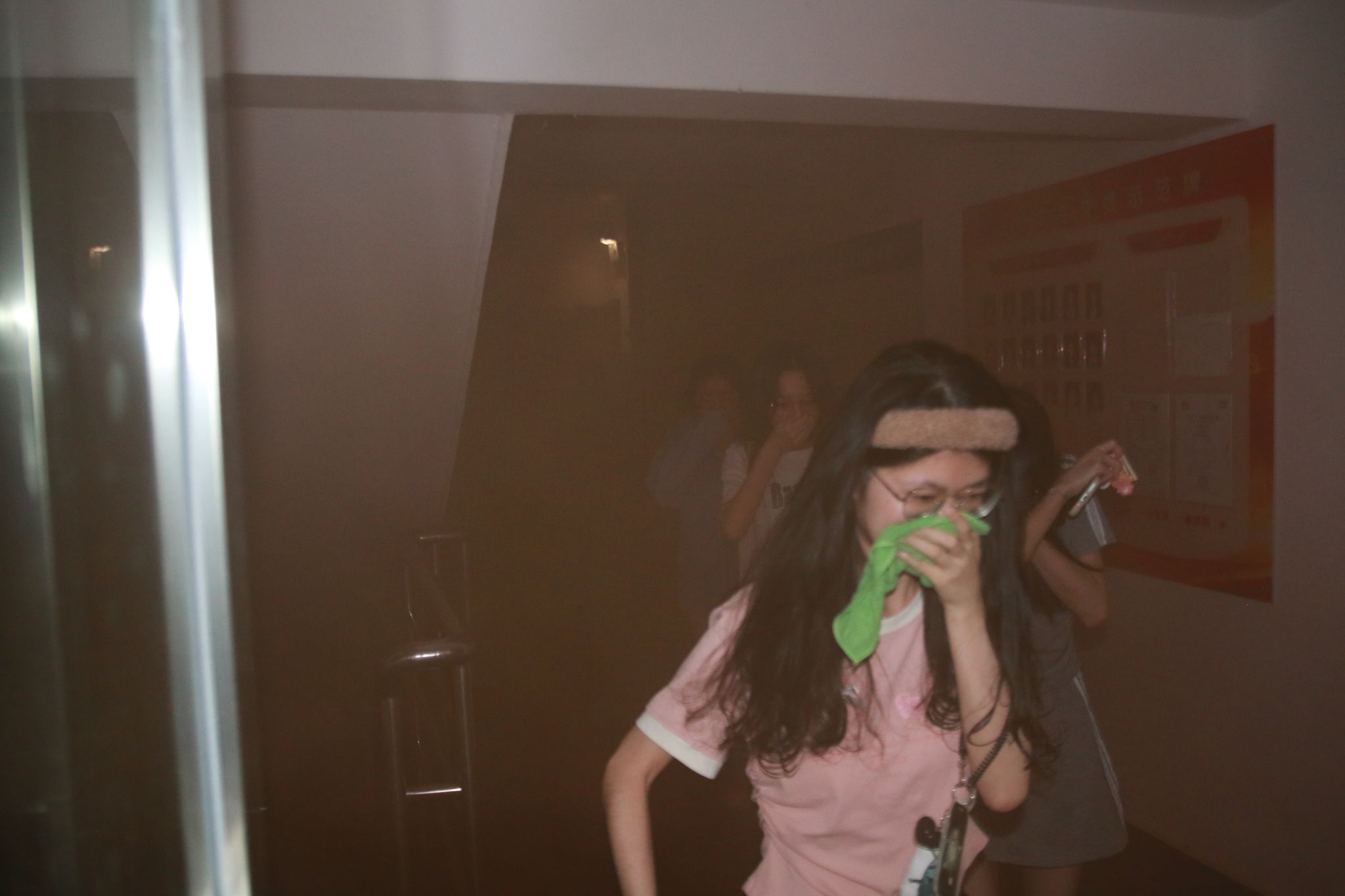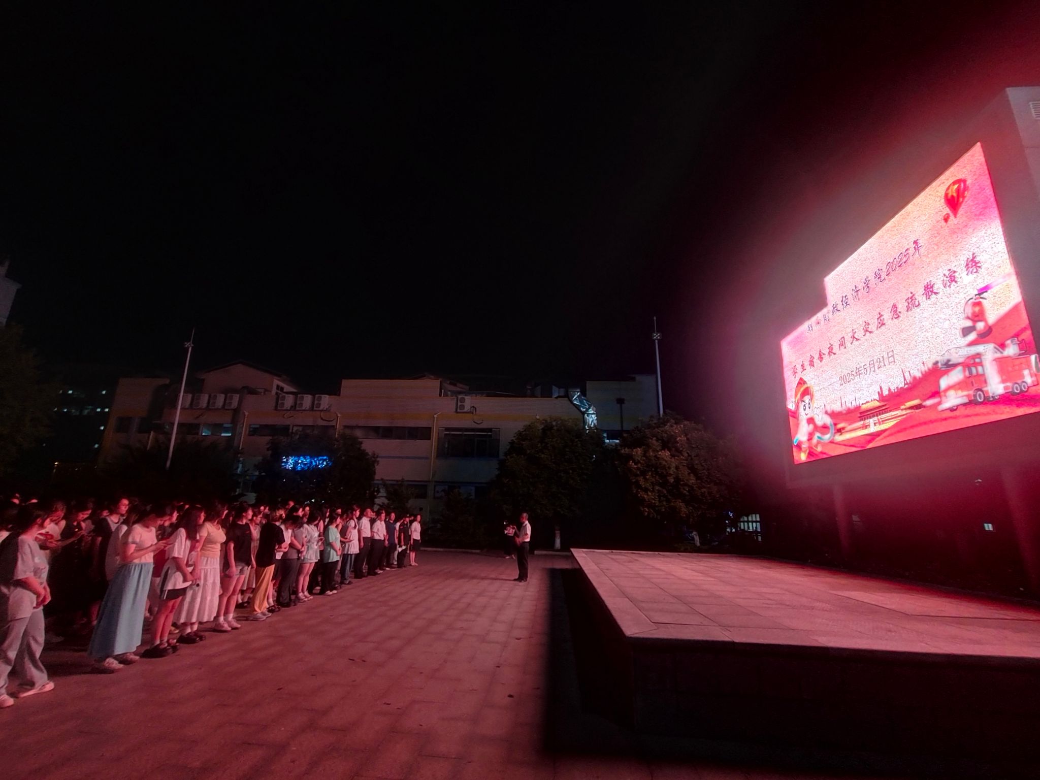 演练以“宿舍楼夜间突发火灾”为背景,21:30分,随着总指挥“演练开始”指令,消防警报随即划破夜空,烟雾弹同步启动,拉开了演练序幕。宿舍内学生迅速披上湿毛巾,弯腰低姿沿指定逃生路线撤离,安保人员和110护卫队成员引导学生有序撤离,医护人员在安全区域待命。全体参演人员从警报触发到全部抵达疏散区域集合点,仅耗时3分50秒。