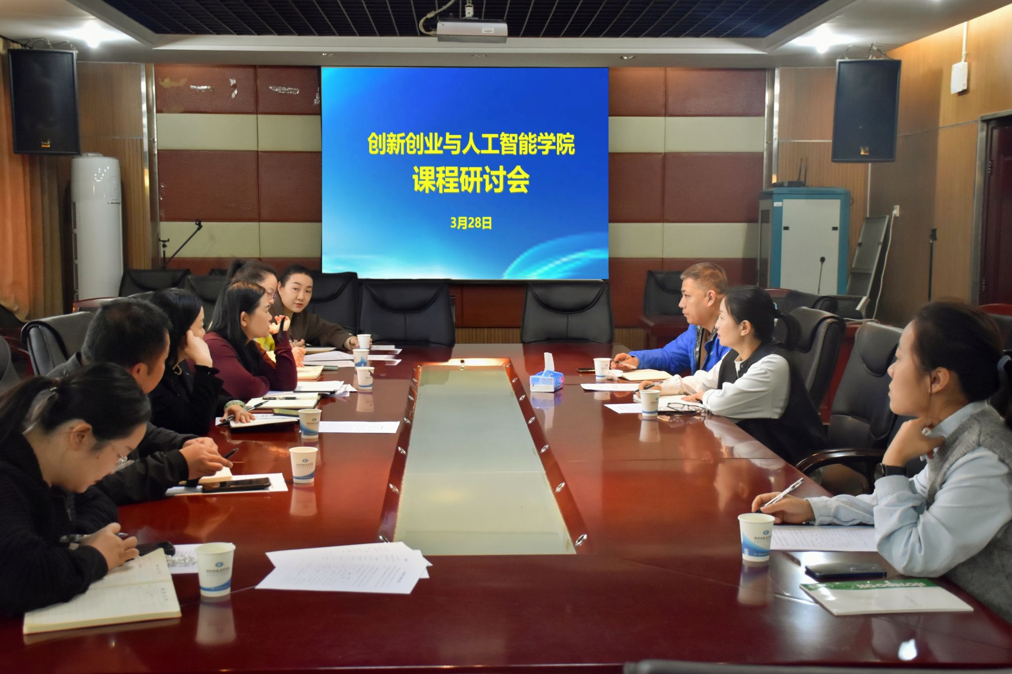 与会教师围绕课程内容重构、教学方法创新、校企协同育人等议题展开热烈讨论,提出增设AI创业案例库、开发企业实训模块等建设性意见。