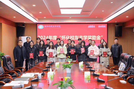 12月19日下午,2024年度“怀化校友志学奖助金”颁奖仪式于学校办公楼715会议室举行。校党委委员、副校长潘爱民为16名获得资助的学生颁发荣誉证书。