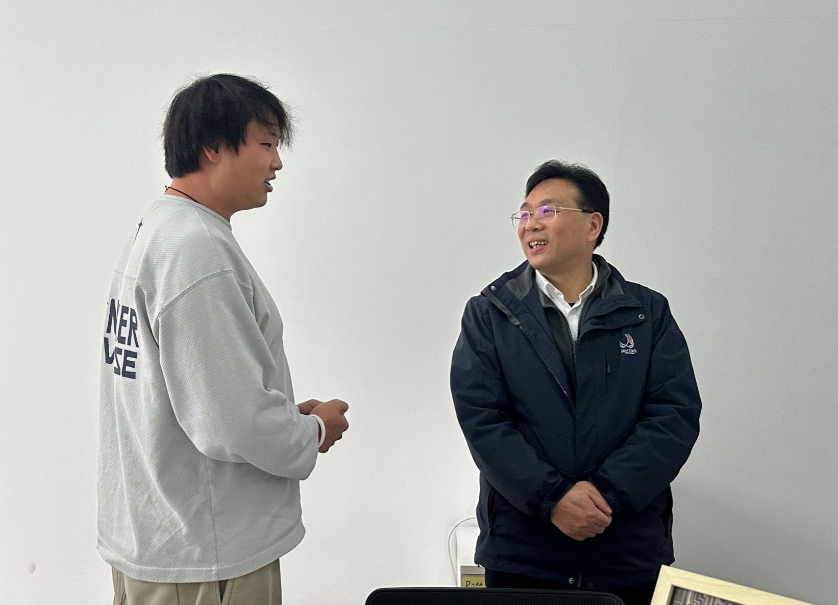 校党委书记易棉阳(右)与学生创新创业项目负责人交流 李欣颖/摄