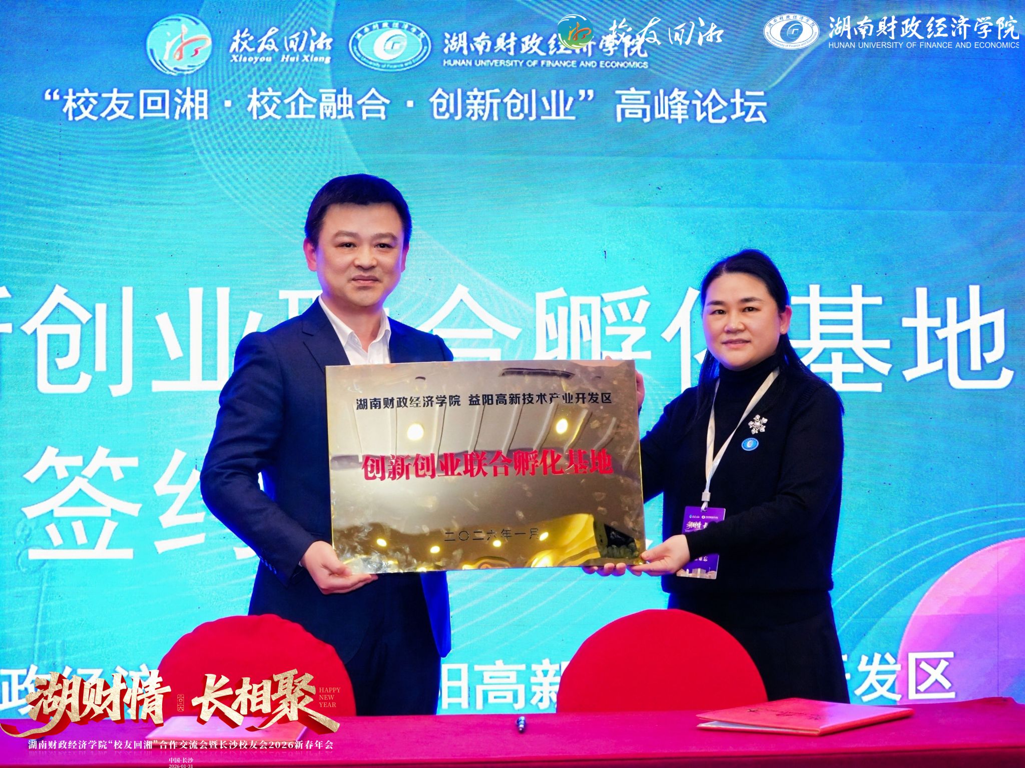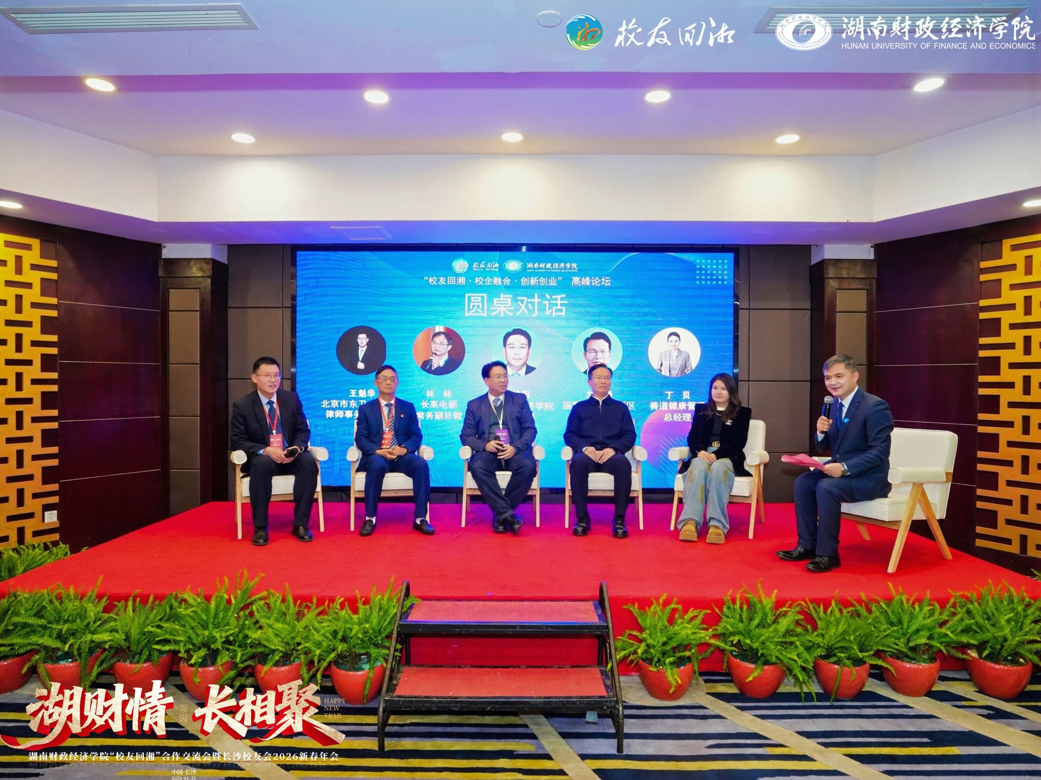 (本网讯)1月31日,学校举办“校友回湘•校企融合•创新创业”系列主题活动。活动通过座谈会、高峰论坛及新春年会等多种形式,搭建起校友与母校间高层次、多维度的交流平台。校党委书记易棉阳,党委副书记、校长苏玲,副校长李小娟,副校长黄渊基,党委委员、宣传部、统战部部长文炳勋,省教育厅校友回湘工作专班主任、支持大学生创业工作专班主任、学生处处长周韶峰等出席活动。来自各行各业的500余名校友齐聚星城、重返母校,围绕学校高质量发展与创新创业生态构建共商良策、贡献智慧。