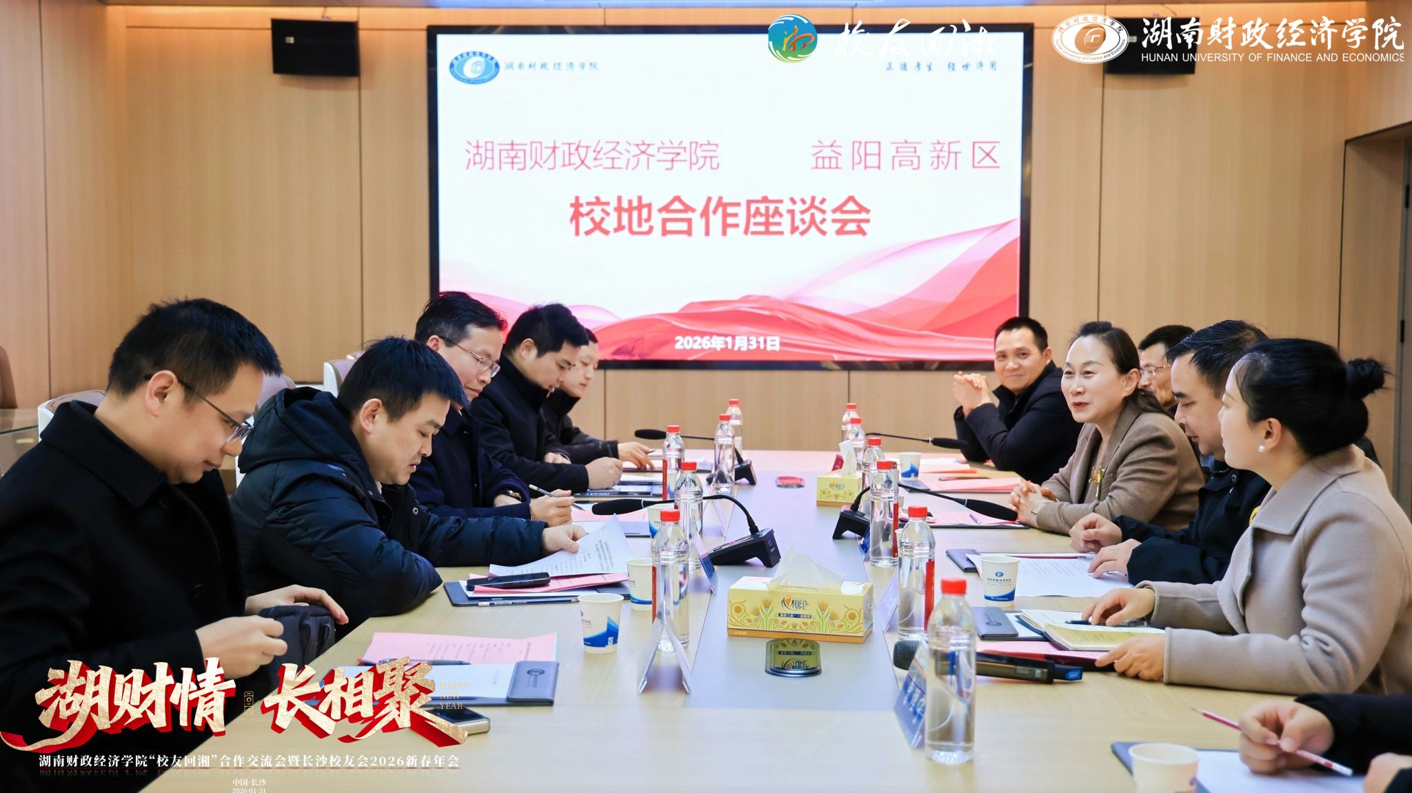 在校地合作座谈会上,校党委副书记、校长苏玲,党委委员、宣传部、统战部部长文炳勋,益阳高新区党工委书记左志锋校友及双方相关单位负责人,围绕人才培养输送、科研成果转化、实习实践基地建设等议题深入交流,并在智慧管网、人工智能、融媒体服务等项目上明确了合作方向。苏玲表示,期望以此次座谈为起点,推动校地联系日益紧密,促进更多科研成果落地产业应用,也希望益阳高新区能为在校师生和广大校友搭建更广阔的实践发展平台。左志锋表示,益阳高新区愿与学校建立长期合作机制,在人才输送、科研转化等方面精准对接,为地方发展注入新动能,并诚挚邀请学校优秀学子扎根益阳、共促发展。