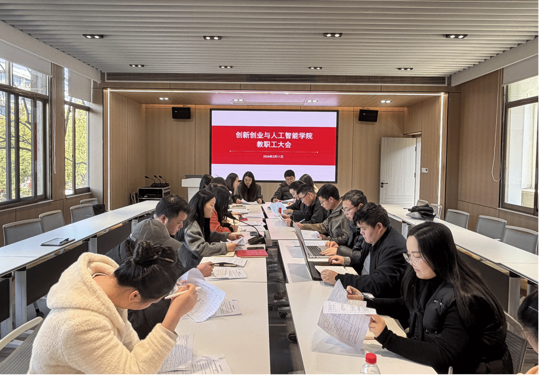 (本网讯)3月11日下午,创新创业与人工智能学院2026年春季新学期开学教职工大会在一教学楼北栋201教室召开,会议由学院直属党支部书记余华主持,学院全体教职工参加会议。