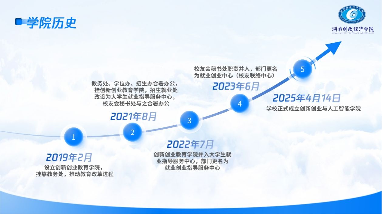 2019年2月,学校设置创新创业教育学院,挂靠教务处。2021年8月,教务处、学位办、招生办合署办公,挂创新创业教育学院;校友会秘书处保留建制,与大学生就业指导服务中心合署办公。2022年7月,原隶属于教务处的创新创业教育学院并入大学生就业指导服务中心,部门更名为就业创业指导服务中心(教辅机构)。2023年6月,原校友会秘书处工作职责并入就业创业指导服务中心,部门更名为就业创业中心(校友联络中心)。2025年4月,学校成立创新创业与人工智能学院,全面负责学校创新创业教育工作,学院由党委书记易棉阳联系。