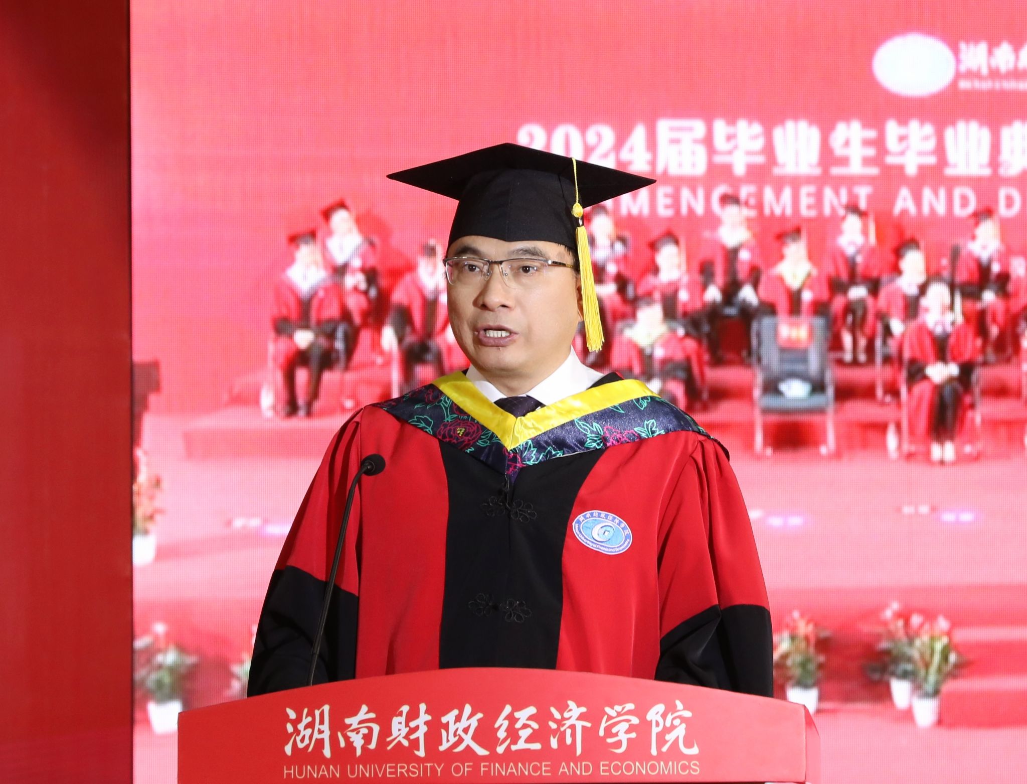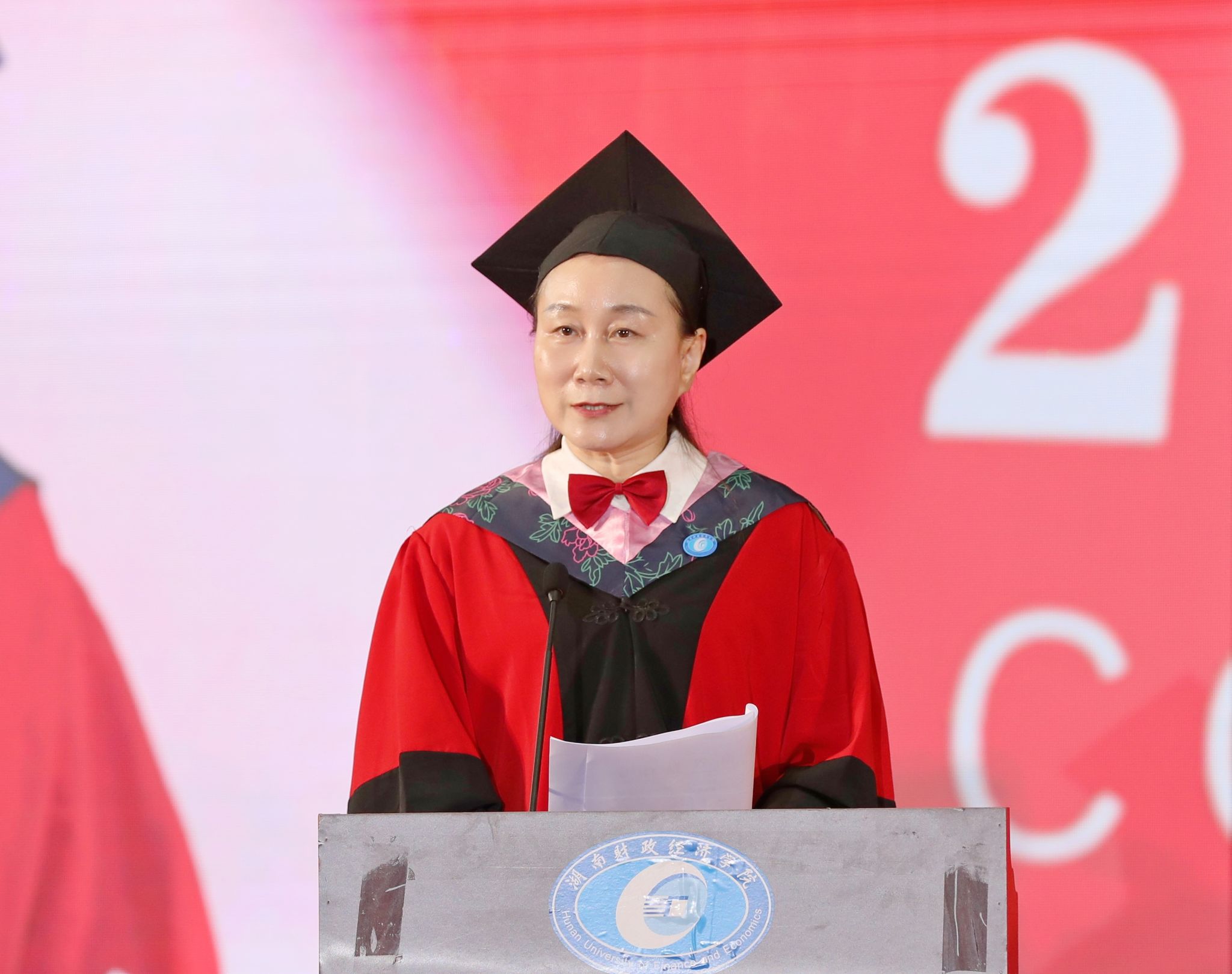 校友代表、省政协委员、株洲地区爱尔眼科医院CEO侯爱利分享了自己的奋斗历程和感悟,勉励毕业生多学一点、多想一点、多干一点,不断提升能力和素养,积极迎接未来的挑战。毕业生代表、会计学院2020级会计二班周敏婷深情回忆了4年大学生活的点点滴滴和成长蜕变,感恩师长的谆谆教诲和同窗的携手同行,号召全体毕业生铭记校训,用行动力量践行新时代中国青年的责任担当。