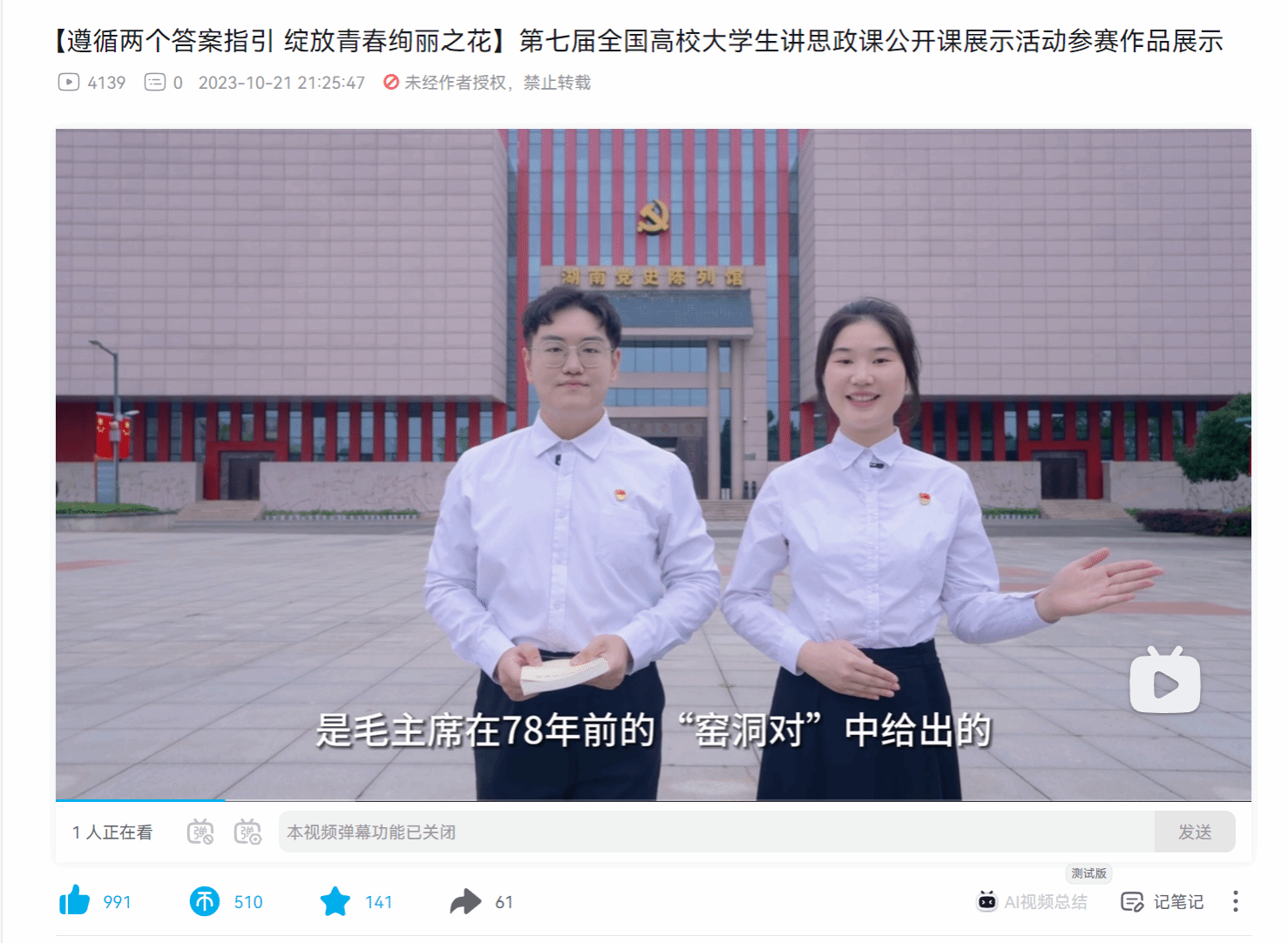 第七届全国高校大学生讲思政课公开课展示活动由教育部高校思想政治理论课教学指导委员会主办、南开大学承办,以“新思想引领新征程·新青年建功新时代”为主题。自比赛启动以来,WilliamHill官网马克思主义学院积极响应、精心组织,充分发挥湖南省红色文化基地的育人作用,指导老师和参赛学生先后赴湖南党史陈列馆、雷锋纪念馆、橘子洲、《恰同学少年》青春剧场等红色场馆,反复录制和修改打磨作品,最后呈现了较好的教育教学效果,获得广大师生和专业评委的一致好评。该作品在新媒体平台进行展播,播放量4000余次,点赞近千次。