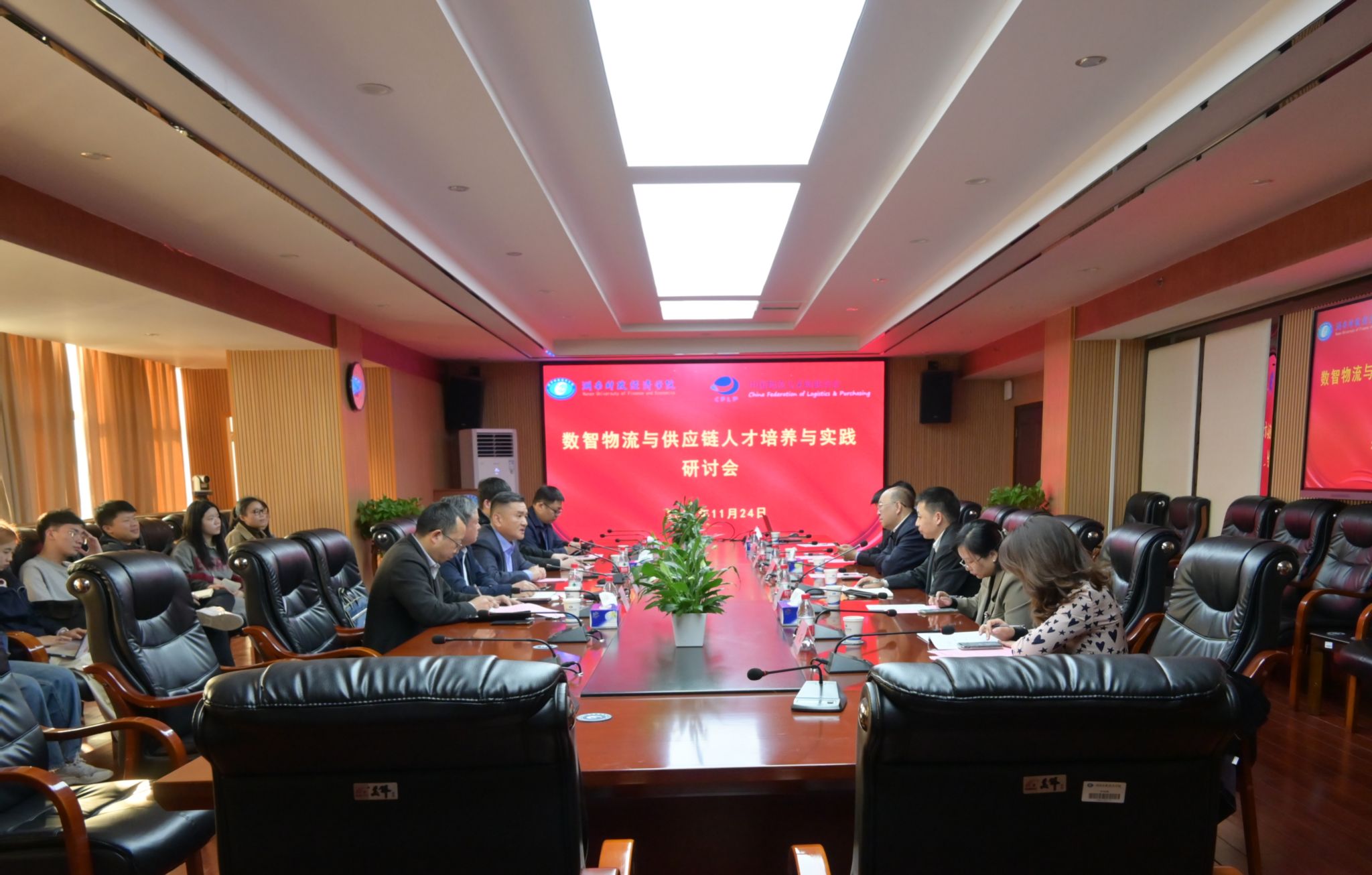 (本网讯)11月24日下午,WilliamHill官网数智物流与供应链人才培养与实践研讨会在主校区办公楼715室召开。副校长赵鹤平,工商管理学院院长杨鹏及学院科研办、物流管理、供应链管理专业负责人和师生代表参加会议。中国物流与采购联合会副秘书长、中国物流学会副会长、教育部物流管理与工程类教指委秘书长郭肇明,湖南省物流与采购联合会副会长蒋社岑,中国物流与采购联合会教育培训部认证办公室主任王亮,湖南省物流与采购联合会评估办主任、教育培训部部长陈远福,湖南众城物流科技有限公司总经理彭中方应邀参加研讨会。会议由工商管理学院院长杨鹏主持。