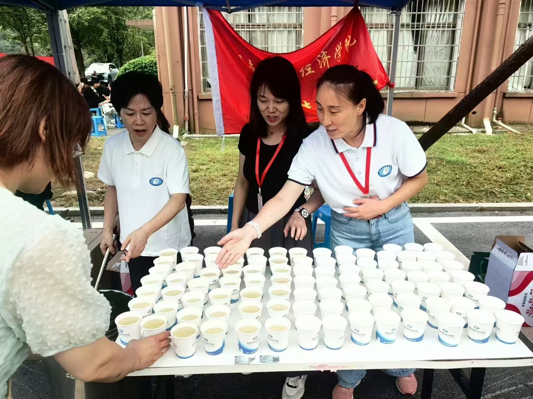 党员先锋队队员们为家长和新生准备的一杯杯解暑凉茶
