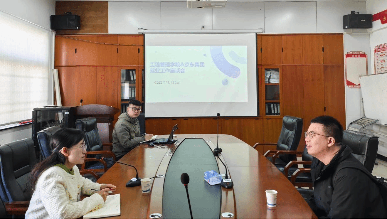 (本网讯)11月25日上午,工程管理学院与京东集团就业工作座谈会在学院911会议室顺利举行。京东集团招聘负责人李柏屹,学院党委副书记刘绿丝、学生工作办公室主任袁仕远出席座谈。