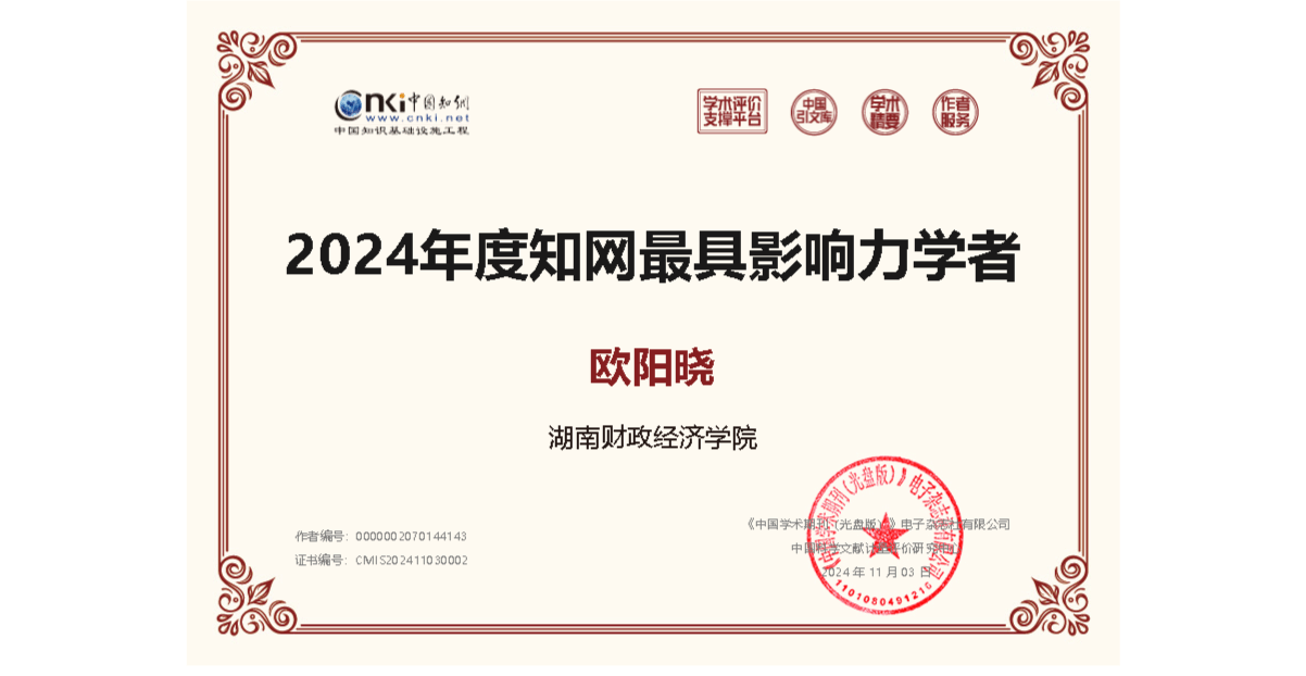 近日,中国知网公布了2024年度知网最具影响力学者名单,工程管理学院副院长欧阳晓博士荣获“2024年度知网最具影响力学者”称号。