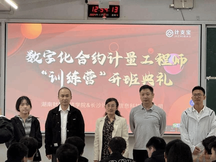 (本网讯)11月7日中午,数字化合约计量工程师“训练营”开班典礼暨长沙计支宝信息科技有限公司专场招聘会在学校3109教室启动。党委副书记刘绿丝、学工办主任袁仕远、毕业班辅导徐湘婷、胡晓峰及专任教师王振宇等出席了活动。