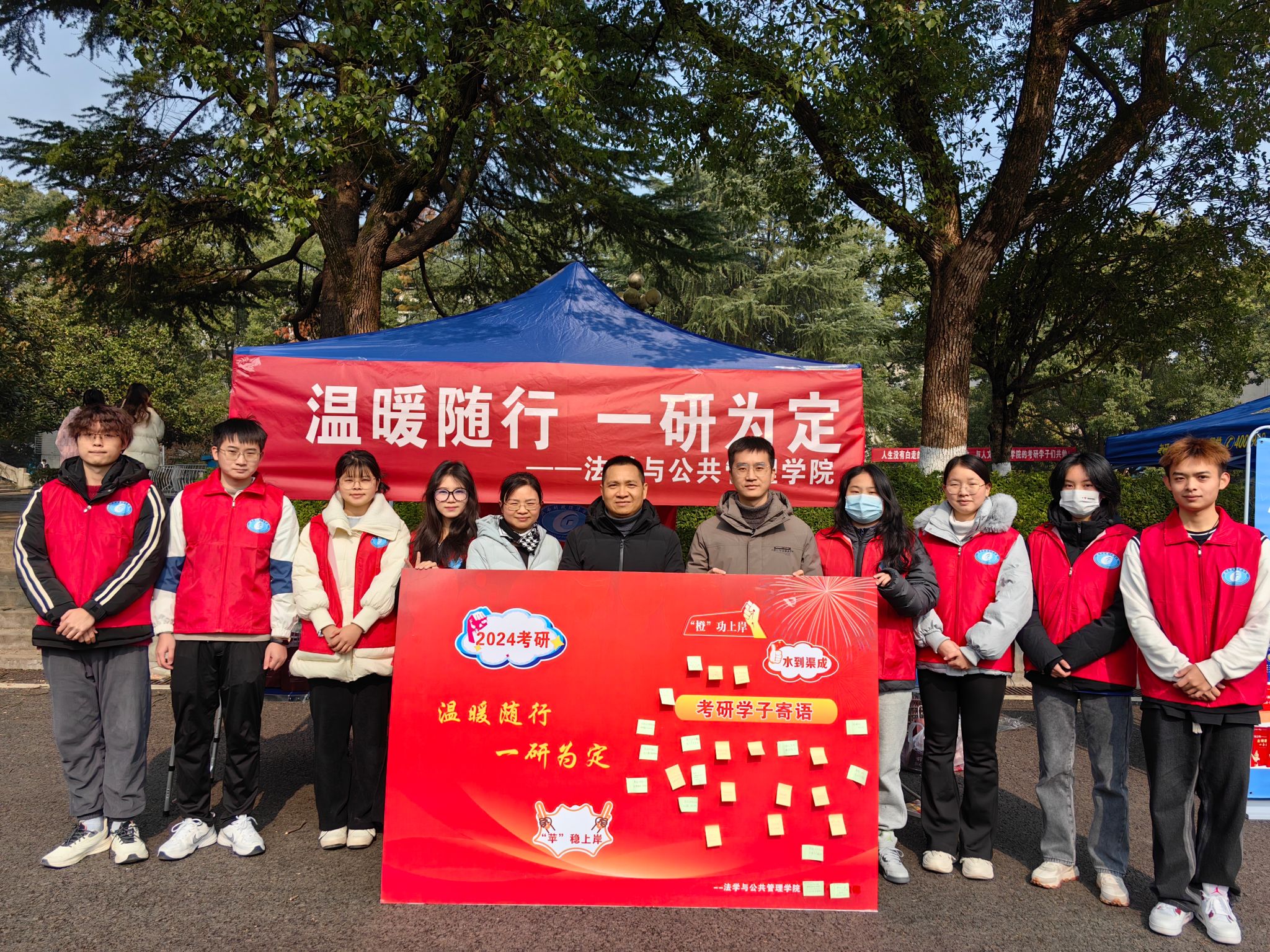 (本网讯)12月21日,为帮助我院考研学子提振考试信心,缓解备考压力,鼓舞考研士气,营造和谐、温暖、友爱的学院氛围,法学与公共管理学院在大礼堂侧面开展了“温暖随行,一研为定”助研活动,学院党委副书记李茂华率队参与此次活动。