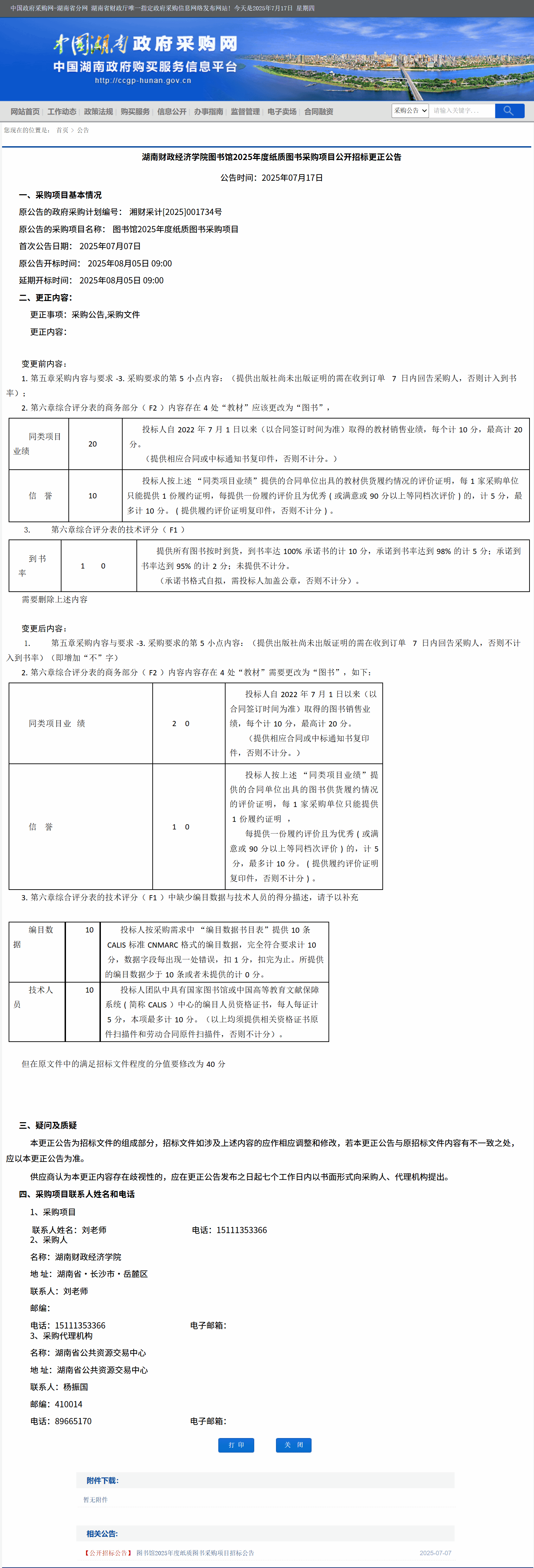湖南省政府采购网:WilliamHill官方网站图书馆2025年度纸质图书采购项目公开招标更正公告