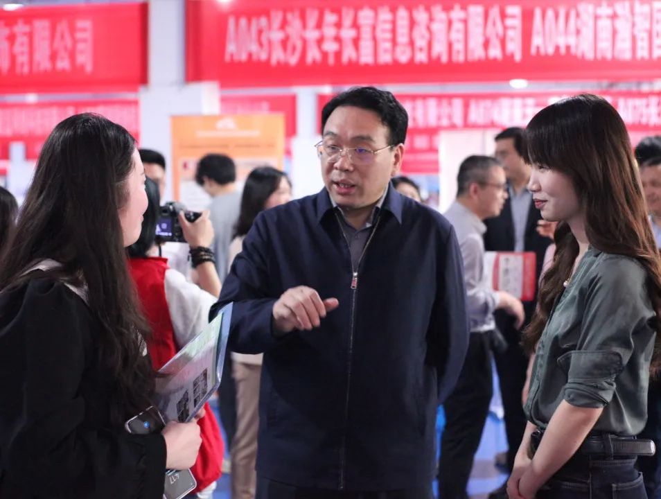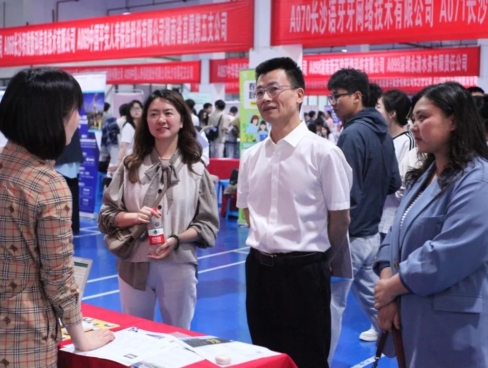 校党委书记易棉阳(左二)来到校友企业展位前与求职学生亲切交谈