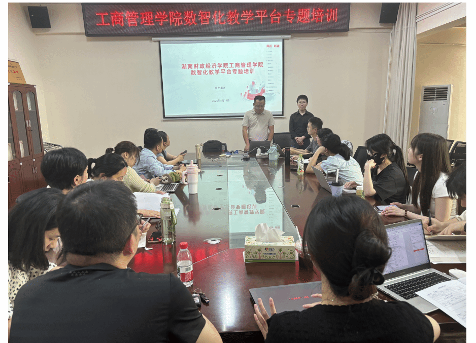 (本网讯)5月14日下午,工商管理学院在办公楼414-1会议室成功举办“数智化教学平台专题培训”。本次培训特邀新道科技股份有限公司湖南分公司教学服务经理曾智豪、邓鑫担任主讲,工商管理系、人力资源管理系全体教师及其他系部青年教师积极参与,现场学习氛围浓厚,反响热烈。