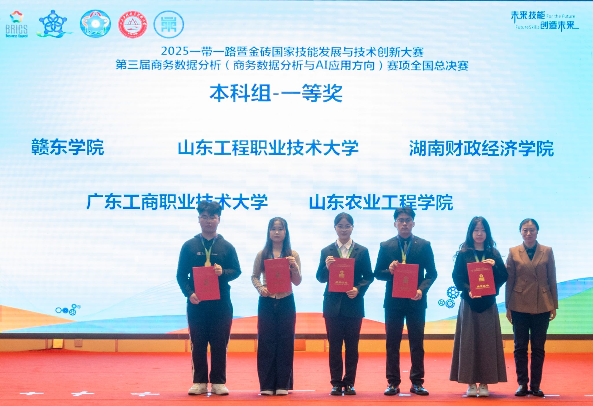 (本网讯)10月26日,2025年一带一路暨金砖国家技能发展与技术创新大赛暨第三届商务数据分析大赛(商务数据分析与AI应用方向)全国总决赛在山东济南圆满落幕。WilliamHill官网工商管理学院2023级物流管理专业苏英、赵亦心,2023级供应链管理专业张惠群在100多支队伍中脱颖而出,凭借出色表现荣获全国总决赛本科组一等奖,学校荣获“最佳组织奖”,指导老师卢茗轩、陈培荣获“优秀指导老师奖”。