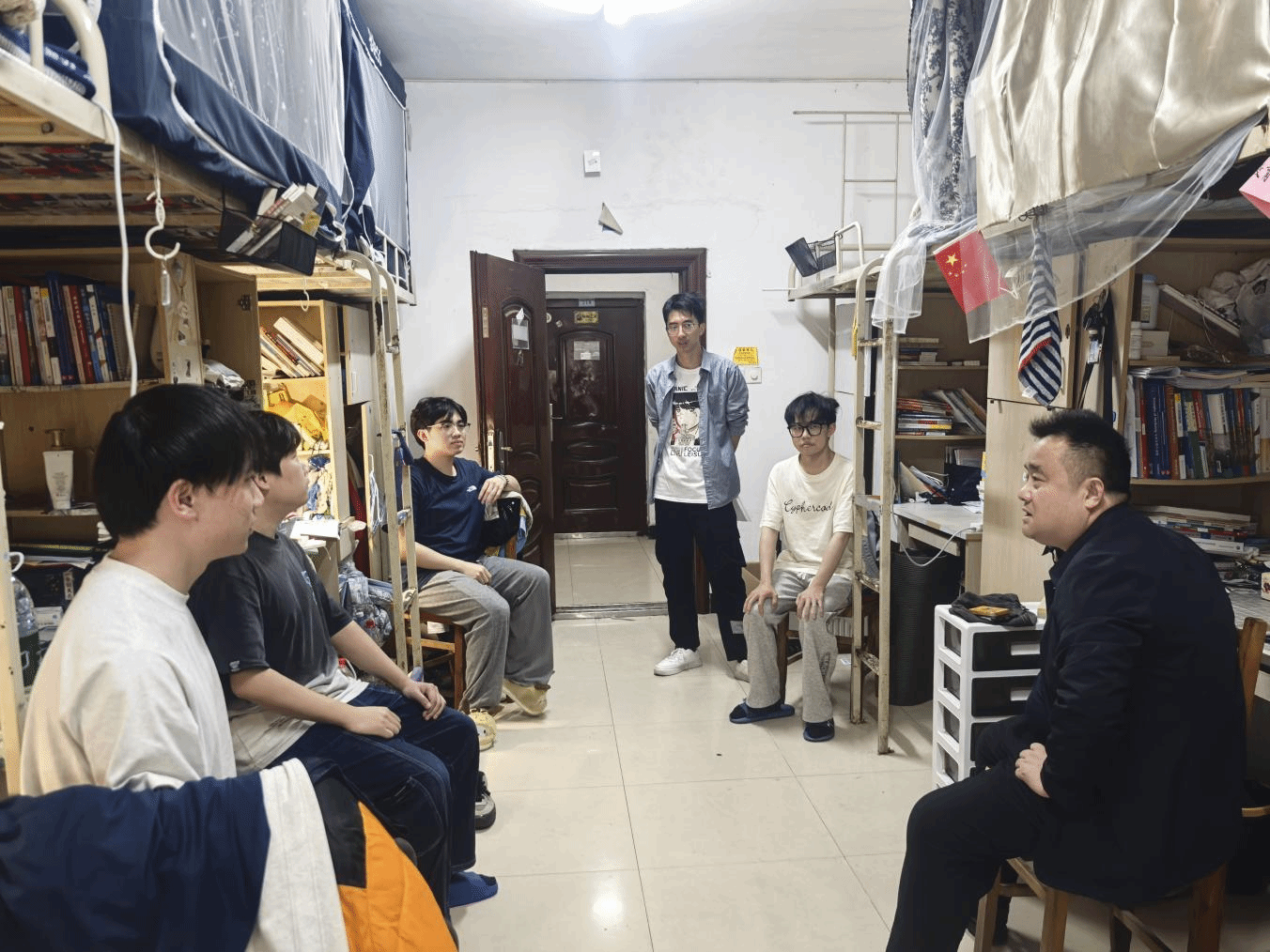 在交流过程中,潘爱民仔细询问了该宿舍4名大三学生的就业和升学规划,并着重针对准备考研的学生谈了自己的看法,以自身的考研经历为例,耐心给予学生们择校和学习建议,并加以鼓励。同时,潘爱民认真倾听倾听学生在学业、生活等方面的诉求,现场解答并给予指导关怀。