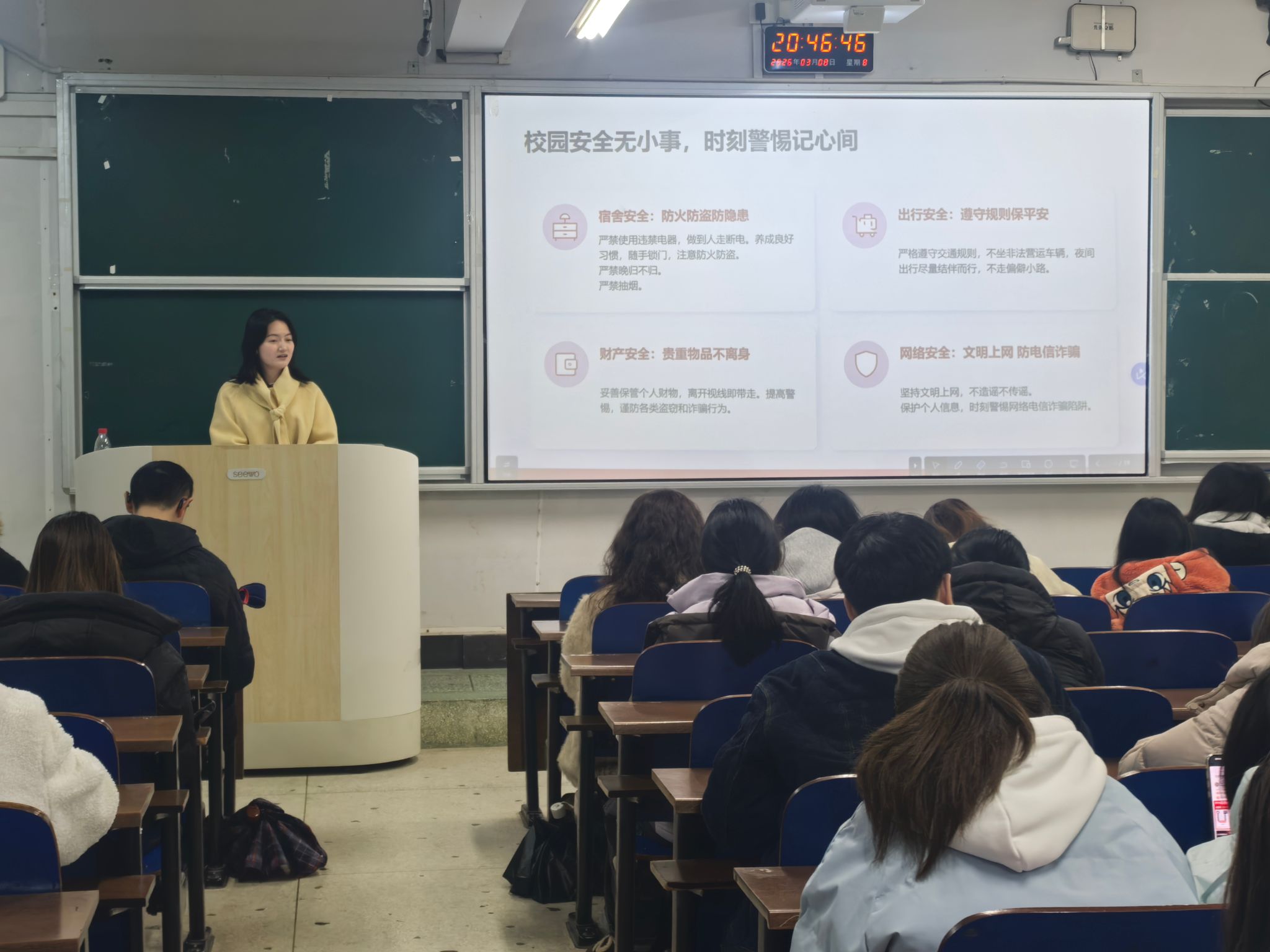 同时,学院各班级同步组织召开“开学第一课讲安全”主题班会。班会围绕校园消防安全、人身安全、防电信网络诈骗、交通安全等核心内容,通过案例讲解、知识问答、安全倡议等形式,向学生普及安全知识和应急处置方法,引导学生树立“安全第一、预防为主”的思想意识,提高学生自我保护能力和安全防范意识,让安全理念入脑入心。