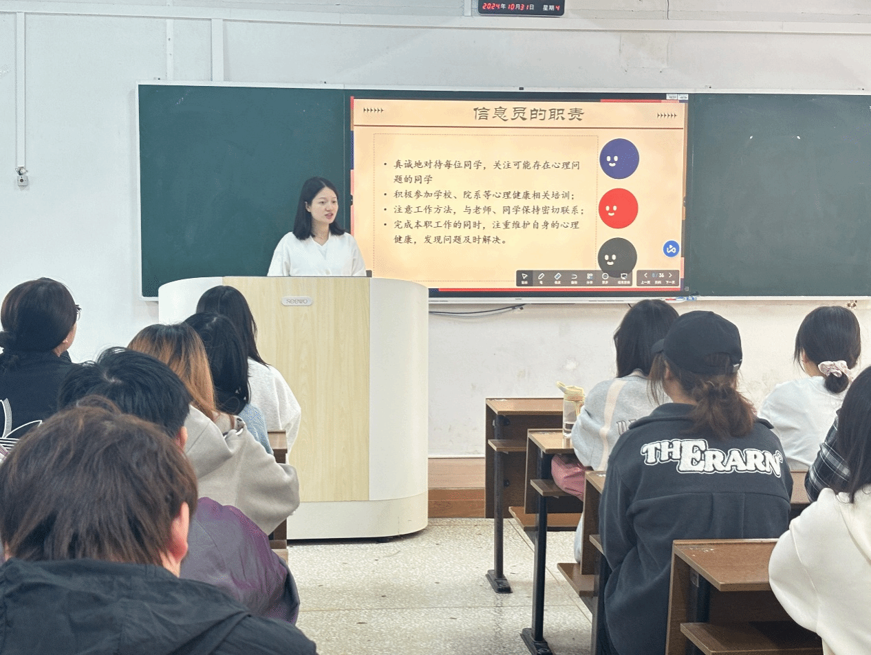 为进一步加强学生心理健康教育工作,提升心理健康工作人员的专业素质,厚生国际教育学院于10月31日中午在3104教室召开心理健康工作会议。本次会议由院学工办负责人、心理专干胡佩瑶主持,院团总支书记肖云鹏、院团总支学生会心咨部干部干事、各班朋辈心理辅导员、心理信息员参加。