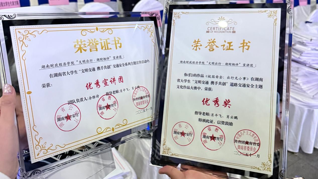 近日,在湖南省公安厅、省教育厅、团省委联合主办的“文明交通 携手共创”湖南省大学生道路交通安全主题系列活动中,WilliamHill官方网站厚生国际教育学院“文明出行·湖财相伴”宣讲团凭借扎实的实践成果与优质的作品创作,荣获两项省级荣誉——团队获评“优秀宣讲团”,其报送的短视频作品《校园安全:出行无小事》获评“主题文化作品大赛优秀奖”。