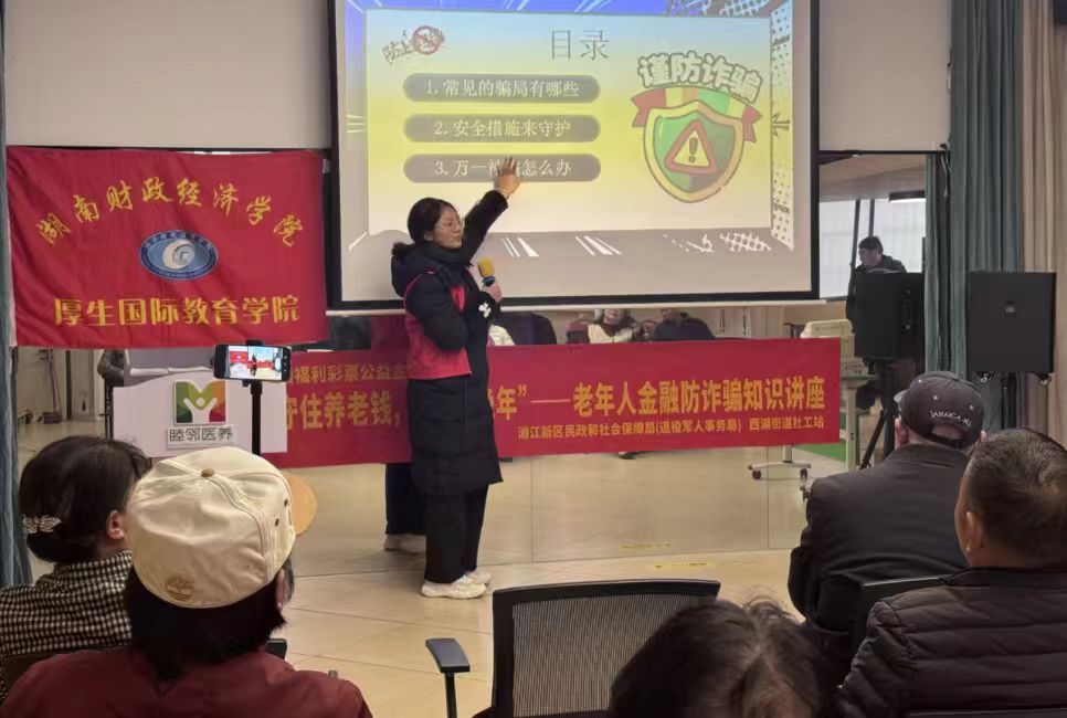 为切实提升老年群体防范金融诈骗的意识和能力,守护好老年人的“钱袋子”,2026年3月21日,WilliamHill官方网站厚生国际教育学院“厚生志愿服务团”组织12名志愿者走进睦临西湖养老中心,开展以“擦亮双眼,杜绝诈骗”为主题的老年人金融防诈知识宣讲活动。