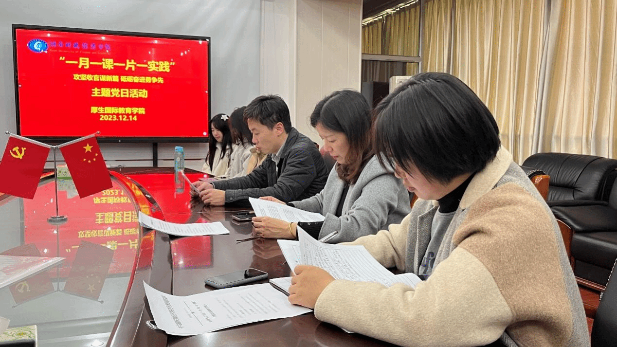 (本网迅)2023年12月14下午,厚生国际教育学院直属党支部在830会议室开展了“攻坚收官谋新篇砥砺奋进勇争先”“一月一课一片一实践”主题党日活动。本次活动由厚生国际教育学院直属党支部书记肖平飞主持,厚生国际教育学院全体教师党员、学生党员出席。