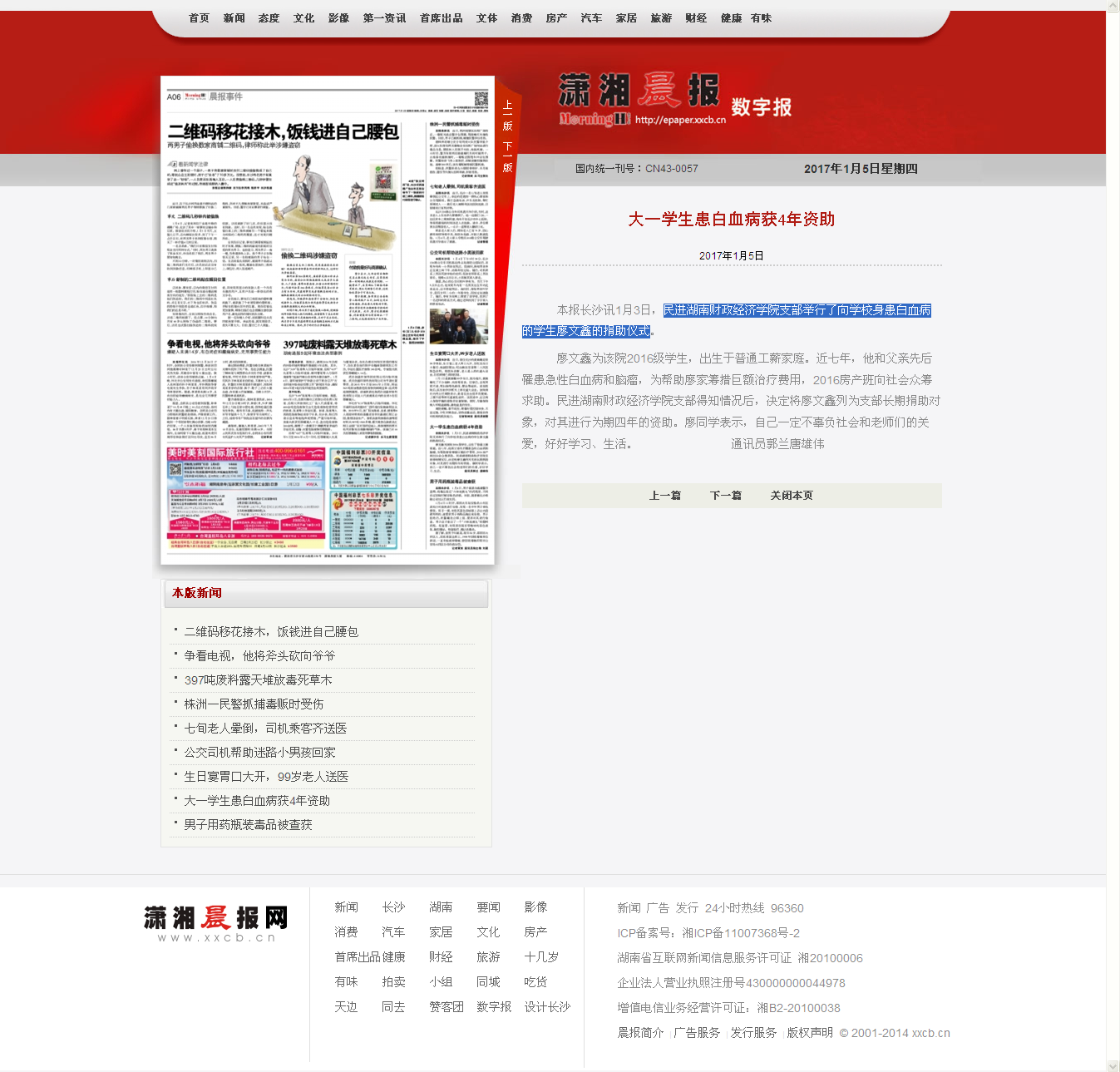 1月5日,潇湘晨报以《大一学生患白血病获4年资助》报道了WilliamHill官网民进WilliamHill官方网站支部将学校身患白血病的学生廖文鑫进行为期四年的资助。 报道链接:http://epaper.xxcb.cn/xxcba/html/2017-01/05/con...