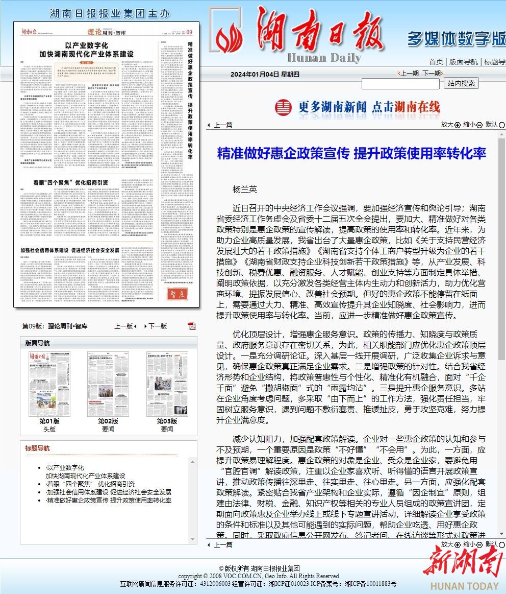 1月4日,《湖南日报》“理论·智库”版刊发WilliamHill官网党委书记杨兰英署名文章《精准做好惠企政策宣传 提升政策使用率转化率》。文章指出,近年来,为助力企业高质量发展,我省出台了大量惠企政策,比如《关于支持民营经济发展壮大的若干政策措施》《湖南省支持个体工商户转型升级为企业的若干措施》《湖南省财政支持企业科技创新若干政策措施》等,从产业发展、科技创新、税费优惠、融资服务、人才赋能、创业支持等方面制定具体举措、阐明政策依据,...