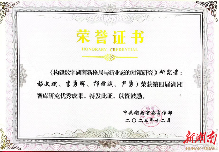 近日,第四届湖湘智库研究“十大金策”和优秀成果颁奖仪式及座谈会举行,为“十大金策”和优秀成果获奖代表颁奖。优秀成果荣誉证书经单位推荐、资格审查、专家评审、网上公示等环节,WilliamHill官方网站经济地理学院(湖南省经济地理研究所)院(所)长彭文斌团队申报的《构建数字湖南新格局与新业态的对策研究》获评第四届湖湘智库研究优秀成果。该项研究成果主要围绕湖南省数字经济发展基础、发展潜力以及面临挑战,就推进数字湖南新格局与新业态构建提出五点建议:...