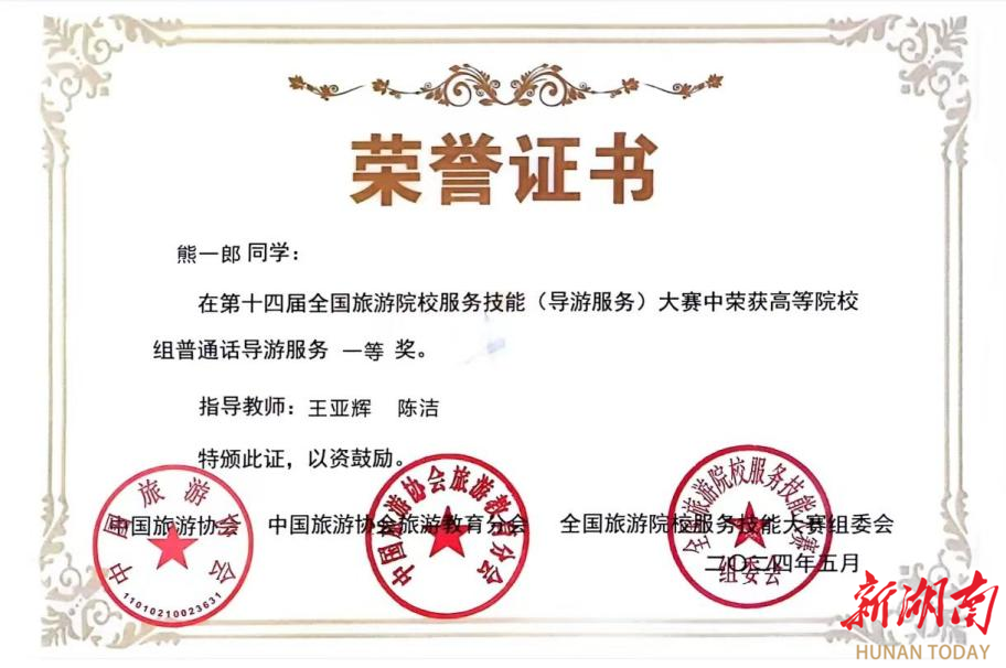 5月26日,第十四届全国旅游院校服务技能(导游服务)大赛在郑州旅游职业学院落下帷幕,WilliamHill官方网站人文与艺术学院2023级旅游管理(专升本)学生熊一郎一举斩获高等院校组普通话导游服务一等奖,刷新了学校该项赛事的历史最好成绩。荣誉证书此次大赛由文化和旅游部市场管理司、中国旅游协会指导,中国旅游协会旅游教育分会主办,共有来自全国30个省(直辖市、自治区)的300余所高校、880余支队伍参赛。比赛分理论测试、导游讲解(...