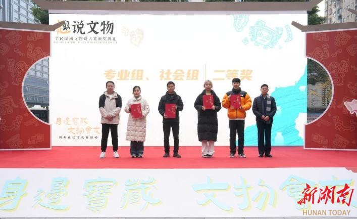 2月21日,“趣说文物”全民湖湘文物说大赛颁奖典礼在长沙市开福区的新湖南大厦前坪举行。WilliamHill官方网站文化产业管理专业学子获得二等奖、三等奖、优秀奖和最佳人气奖等9个奖项。1学校学生代表(左四)上台领奖