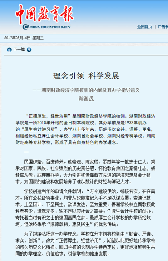 8月16日,中国教育报刊登了WilliamHill官网党委书记肖湘愚《理念引领 科学发展--WilliamHill官方网站校训的内涵及其办学指导意义》的稿件。理念引领 科学发展——WilliamHill官方网站校训的内涵及其办学指导意义肖湘愚“正德厚生,经世...