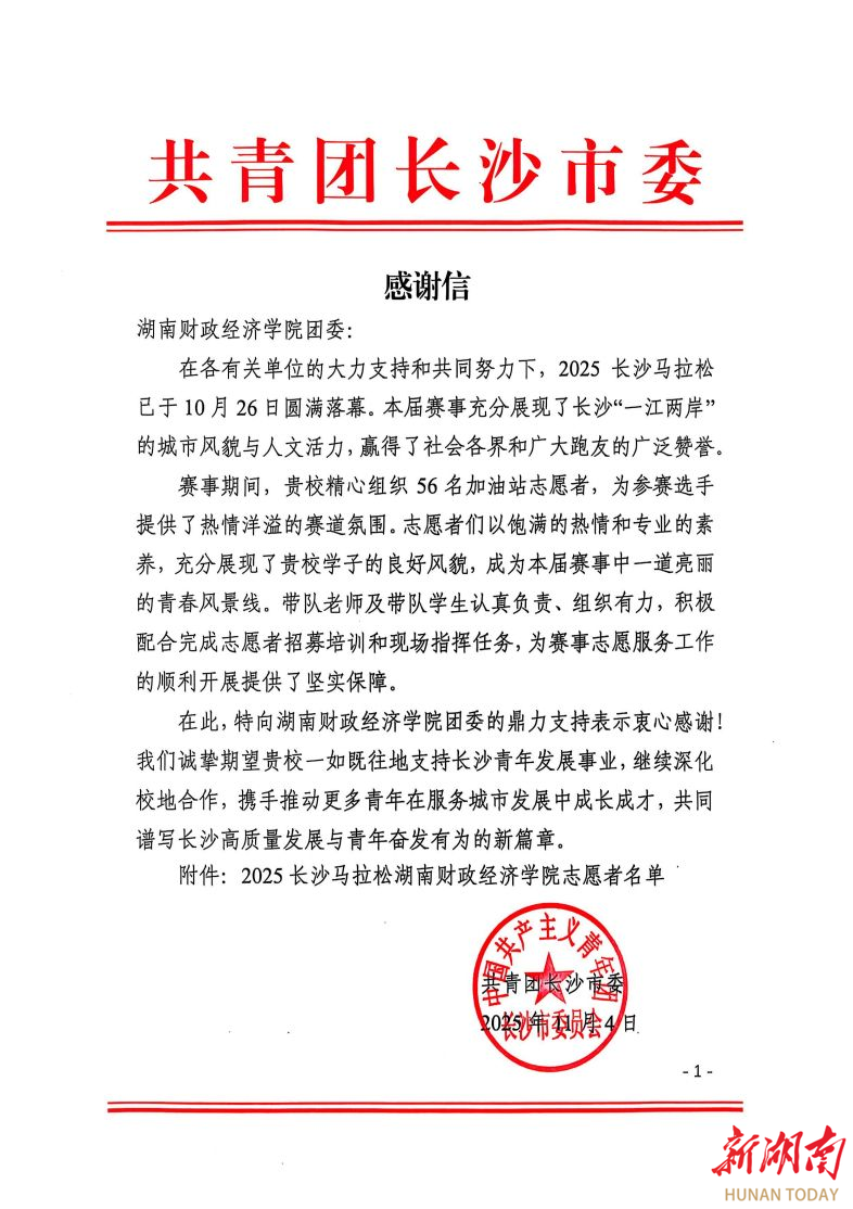 新湖南:湖南财院马拉松志愿服务获共青团长沙市委致信感谢