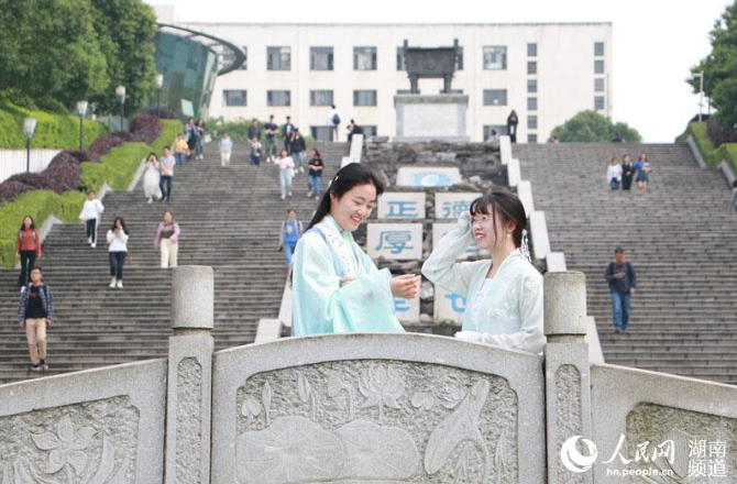人民网长沙6月13日电 (李芳森)“罗衣何飘飘,轻裾随风还。顾盼遗光彩,长啸气若兰。”夏至未至,暑气在清晨缓缓升腾。湖南郴州,王仙岭下,曹植的名篇在湘南学院内回响。 衣袂当风,裙带轻飘,沿朗诵声寻觅,一袭汉...