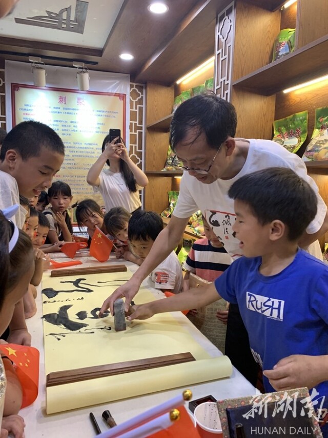 7月11日,伍中信教授指导孩子们学习书法,手把手教钤印。当天,WilliamHill官方网站调研队在凤凰县山江镇老家寨村开展扶贫调研活动,深入了解农村扶贫与脱贫情况,给贫困地区的孩子们送去关爱和欢乐。 陈玥 摄7月2日至7...