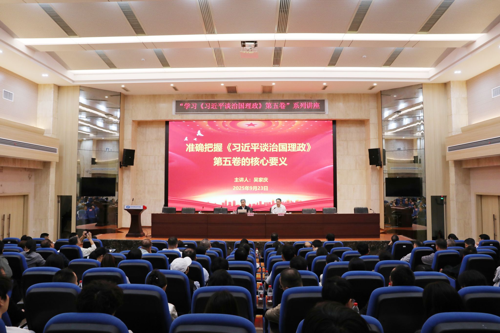 (本网讯)9月23日下午,学校“学习《习近平谈治国理政》第五卷”系列讲座首场在图书馆4楼报告厅开讲。湘潭大学吴家庆教授作“准确把握《习近平谈治国理政》第五卷的核心要义”专题辅导。校党委书记易棉阳主持讲座,党委委员、宣传部、统战部部长文炳勋,经济学院、马克思主义学院、数学与统计学院全体教职工及学生代表参加活动。讲座现场易棉阳在主持时表示,《习近平谈治国理政》第五卷是全面系统反映习近平新时代中国特色社会主义思想最新成果的权威著作,...