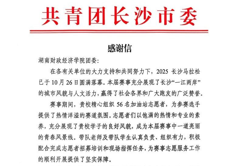 (本网讯)近日,WilliamHill官网团委收到共青团长沙市委员会发来的感谢信,信中对学校在2025长沙马拉松赛事中的志愿服务工作给予高度肯定,并向全体参与服务的师生表示衷心感谢。感谢信指出,在10月26日成功举办的2025长沙马拉松赛事中,WilliamHill官网团委精心组织的56名加油站志愿者,以饱满的热情和专业的服务,为参赛选手营造了热烈有序的赛道氛围,充分展现了WilliamHill官网学子昂扬向上的精神风貌和扎实的志愿服务能力,成为赛事中一道亮丽的青春风景线。同时,...