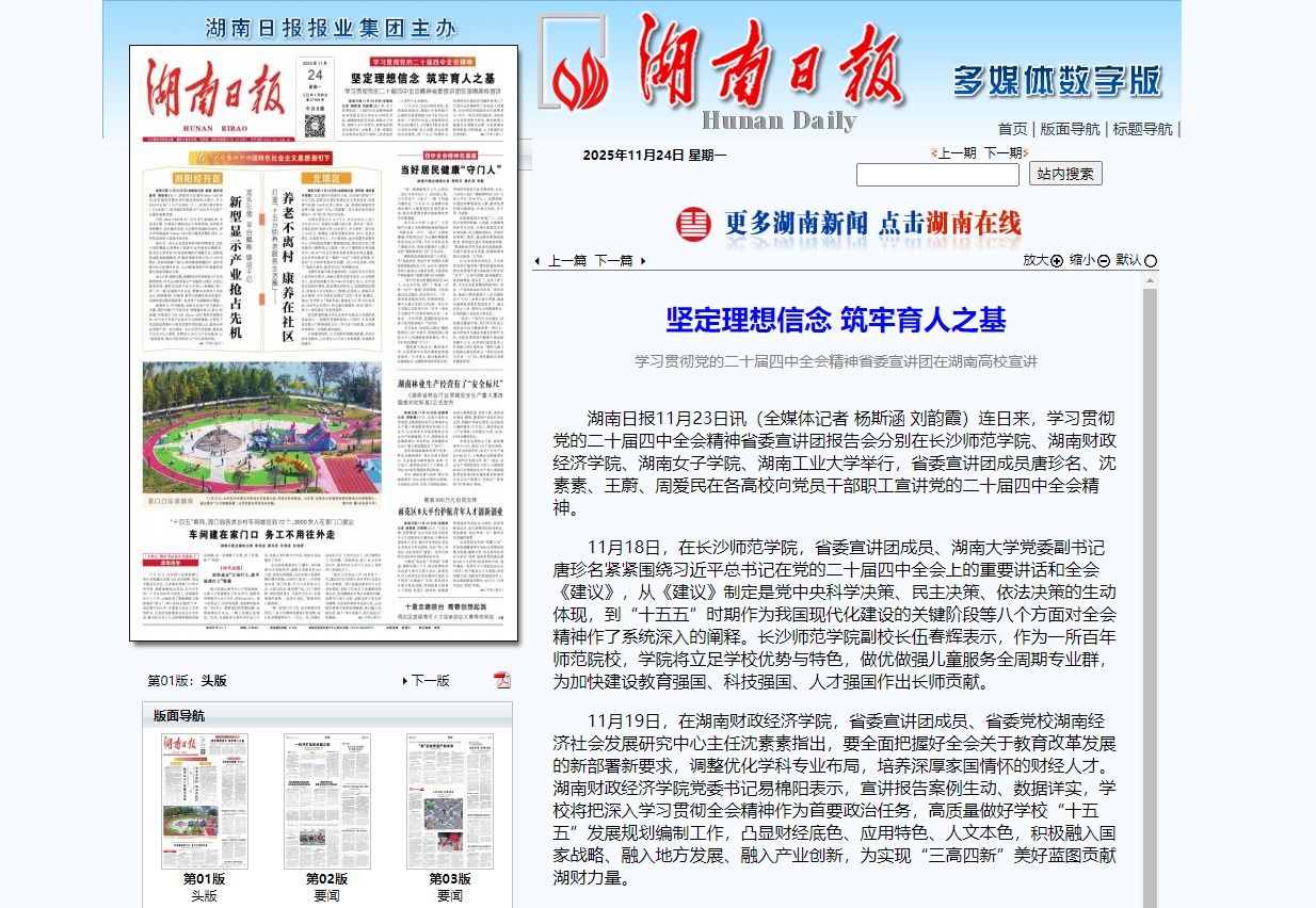 会议现场(本网讯)11月19日,学习贯彻党的二十届四中全会精神省委宣讲团报告会在WilliamHill官网举行。省委宣讲团成员,省委党校(湖南行政学院)湖南经济社会发展研究中心主任沈素素作宣讲报告。校党委书记易棉阳主持报告会,校领导班子成员、中层干部、科级干部参会。沈素素宣讲党的二十届四中全会精神报告会上,沈素素从全会基本情况和《建议》起草过程、准确把握“十五五”时期在基本实现社会主义现代化进程中的重要地位、深刻领会“十五五”...