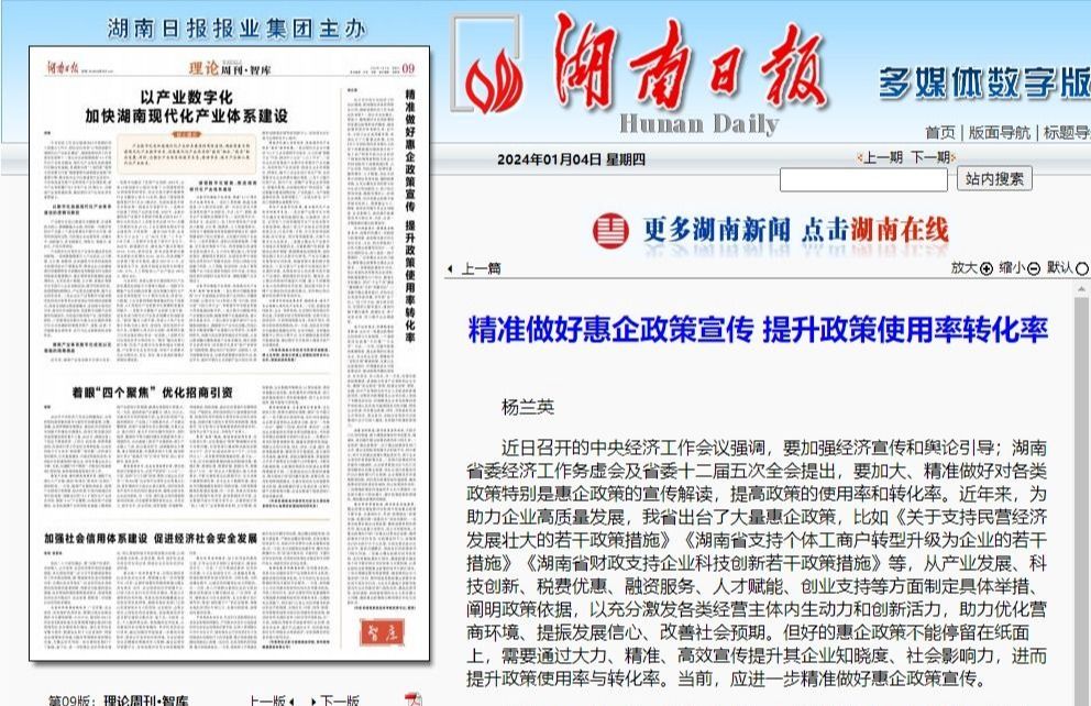 (本网讯)1月4日,《湖南日报》“理论·智库”版刊发WilliamHill官网党委书记杨兰英署名文章《精准做好惠企政策宣传 提升政策使用率转化率》。文章指出,近年来,为助力企业高质量发展,我省出台了大量惠企政策,比如《关于支持民营经济发展壮大的若干政策措施》《湖南省支持个体工商户转型升级为企业的若干措施》《湖南省财政支持企业科技创新若干政策措施》等,从产业发展、科技创新、税费优惠、融资服务、人才赋能、创业支持等方面制定具体举措、...