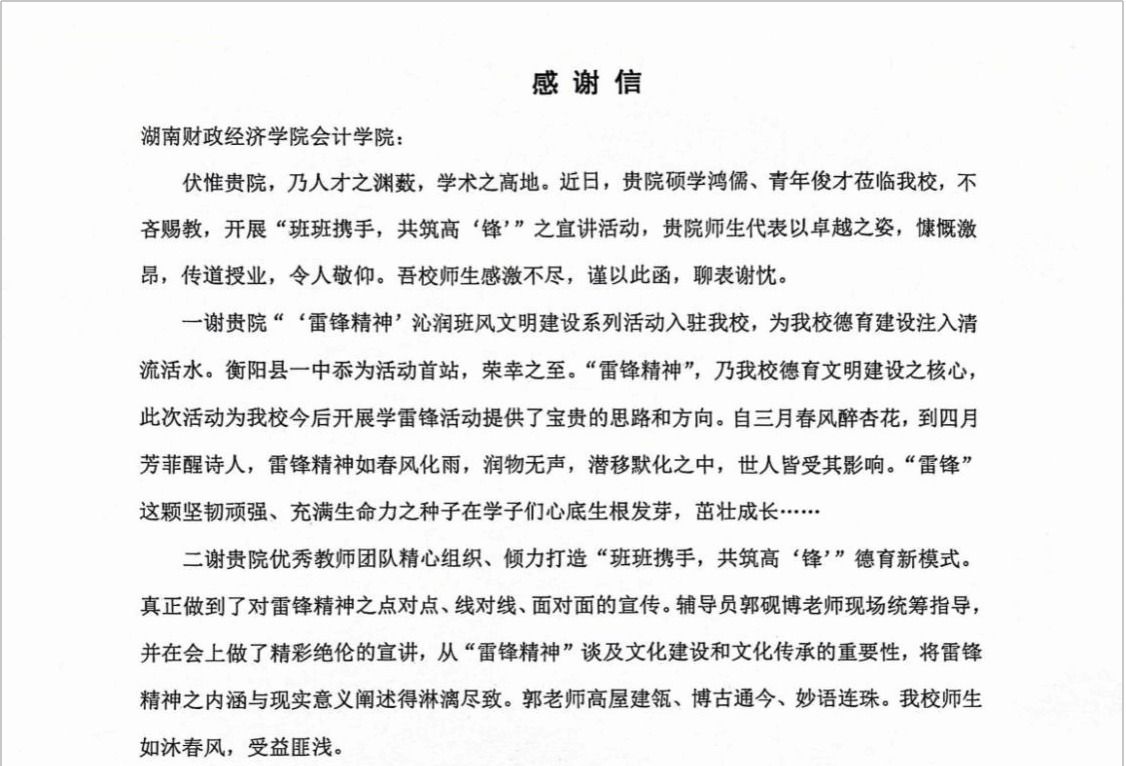 (本网讯)近日,WilliamHill官网会计学院收到一封来自衡阳县一中的感谢信,信中对2023级会计学(专升本)一、二班的学生干部组织的“雷锋精神沁润班风文明建设系列活动”之“班班携手 共筑高锋”实践活动给予了高度赞扬。信中这样写到:“近日,贵院硕学鸿儒、青年俊才莅临WilliamHill官网,不吝赐教,开展‘班班携手,共筑高锋’之宣讲活动,贵院师生代表以卓越之姿,慷慨激昂,传道授业,令人敬仰。吾校师生感激不尽,谨以此函,聊表谢忱。”这封信不仅是对会计学院特色系列活动的高度评价,...