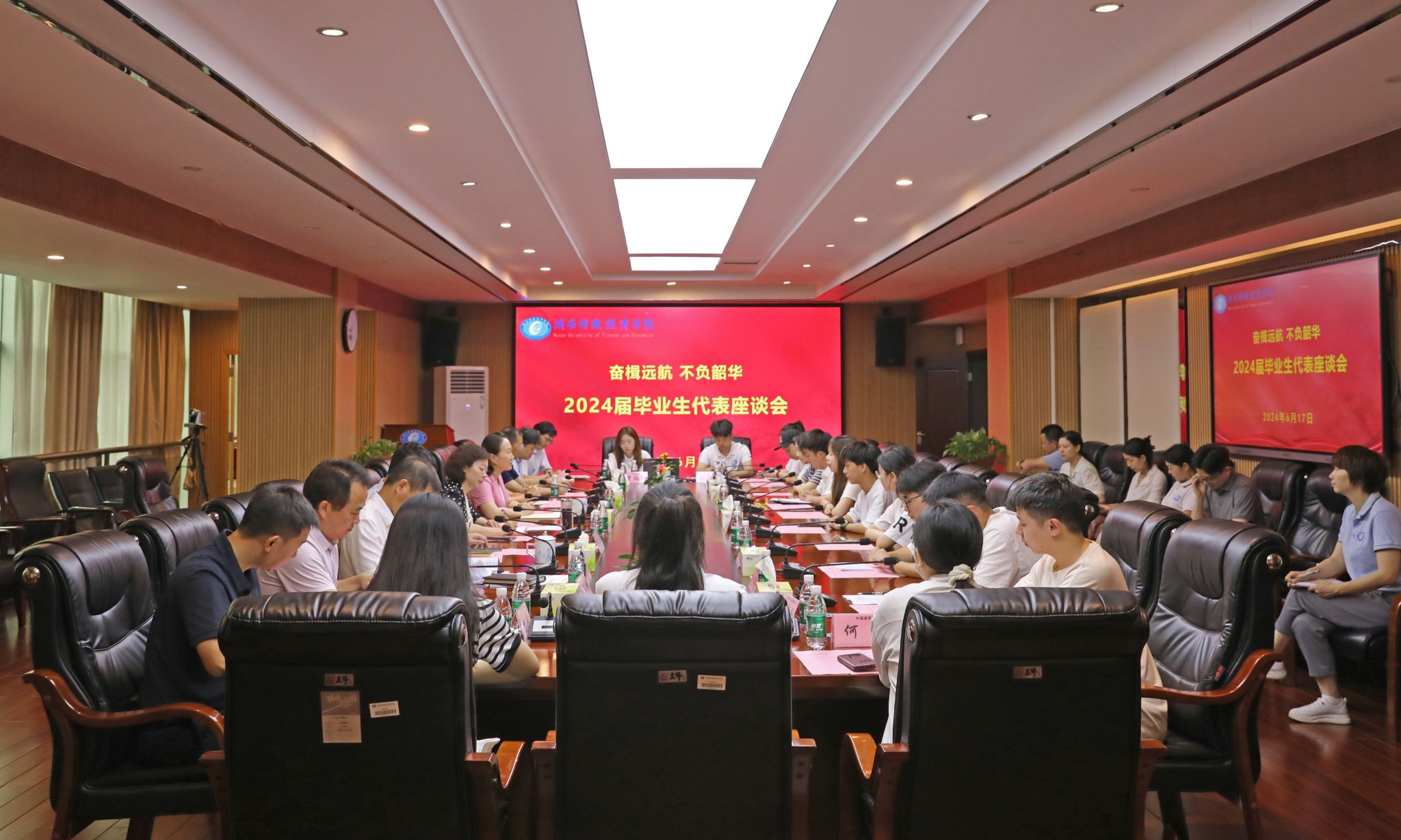 (本网讯)6月17日上午,“奋楫远航,不负韶华”2024届毕业生代表座谈会在主校区办公楼715会议室举行,校党委书记杨兰英、党委副书记苏玲及相关职能部门负责人与15位毕业生代表共话师生别情,展望湖财美好未来。会议由苏玲主持。会议现场会上,毕业生代表们回顾了他们在校的精彩生活和难忘瞬间,分享了学习生活所感所悟,表达了对师长谆谆教诲的感恩之情,送上了对母校的美好祝福,同时就学校高质量发展提出了恳切的意见和建议。杨兰英表示,...