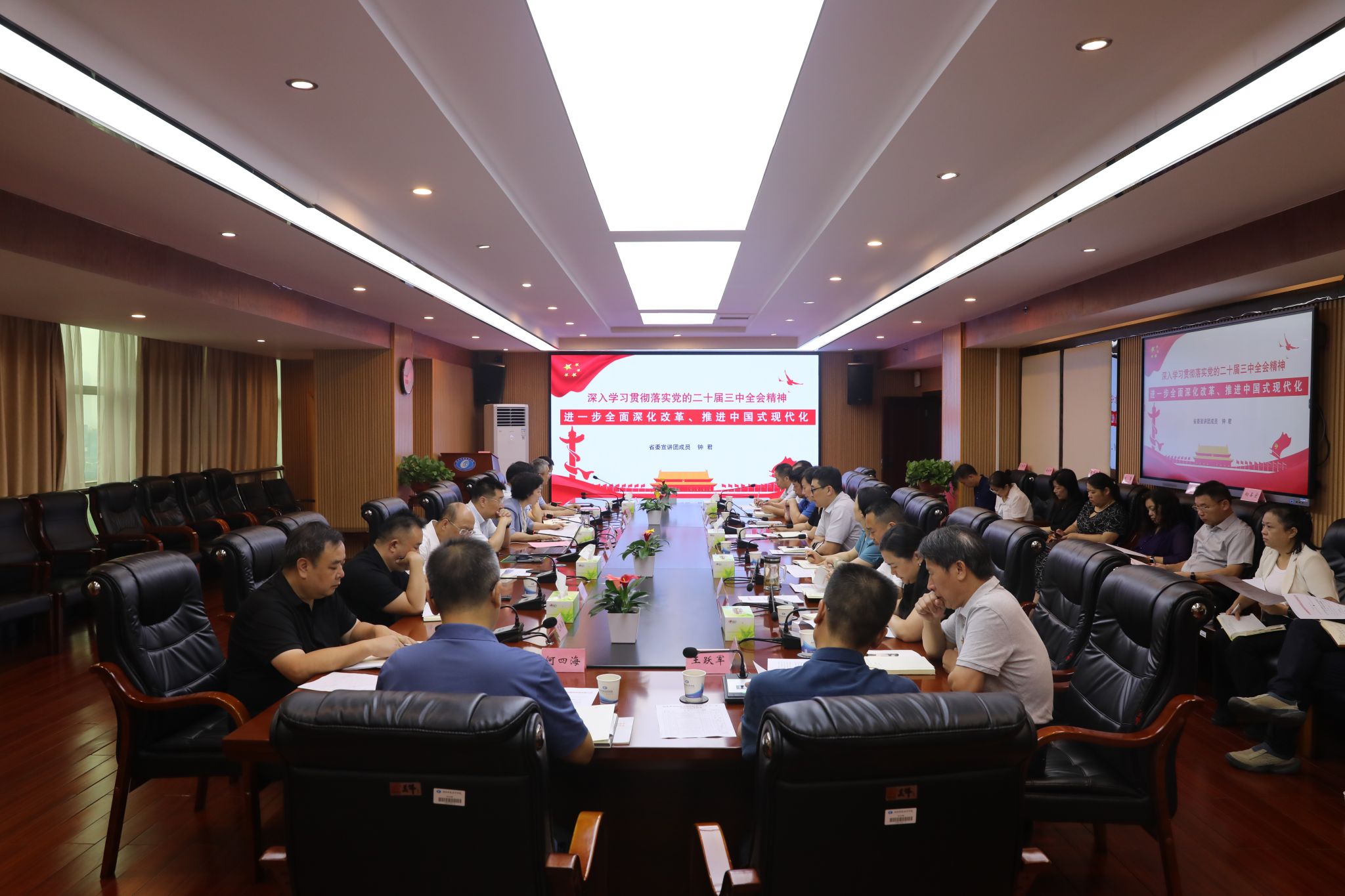 (本网讯)9月20日,校党委理论学习中心组在主校区办公楼715会议室召开集中(扩大)学习研讨会,邀请省社科院(省政府发展研究中心)党组书记、院长(主任) 钟君作专题辅导报告,进一步深研细悟全会精神,统筹抓好工作落实。校党委书记杨兰英主持并作总结讲话,全体校领导、党务部门主要负责人、二级党组织主要负责人参加学习。专题辅导报告会现场 肖萌/摄钟君作专题辅导报告 邓柳/摄钟君围绕党的二十届三中全会精神的核心要义、全面深化改革与中国式现代化的辩证关系、...