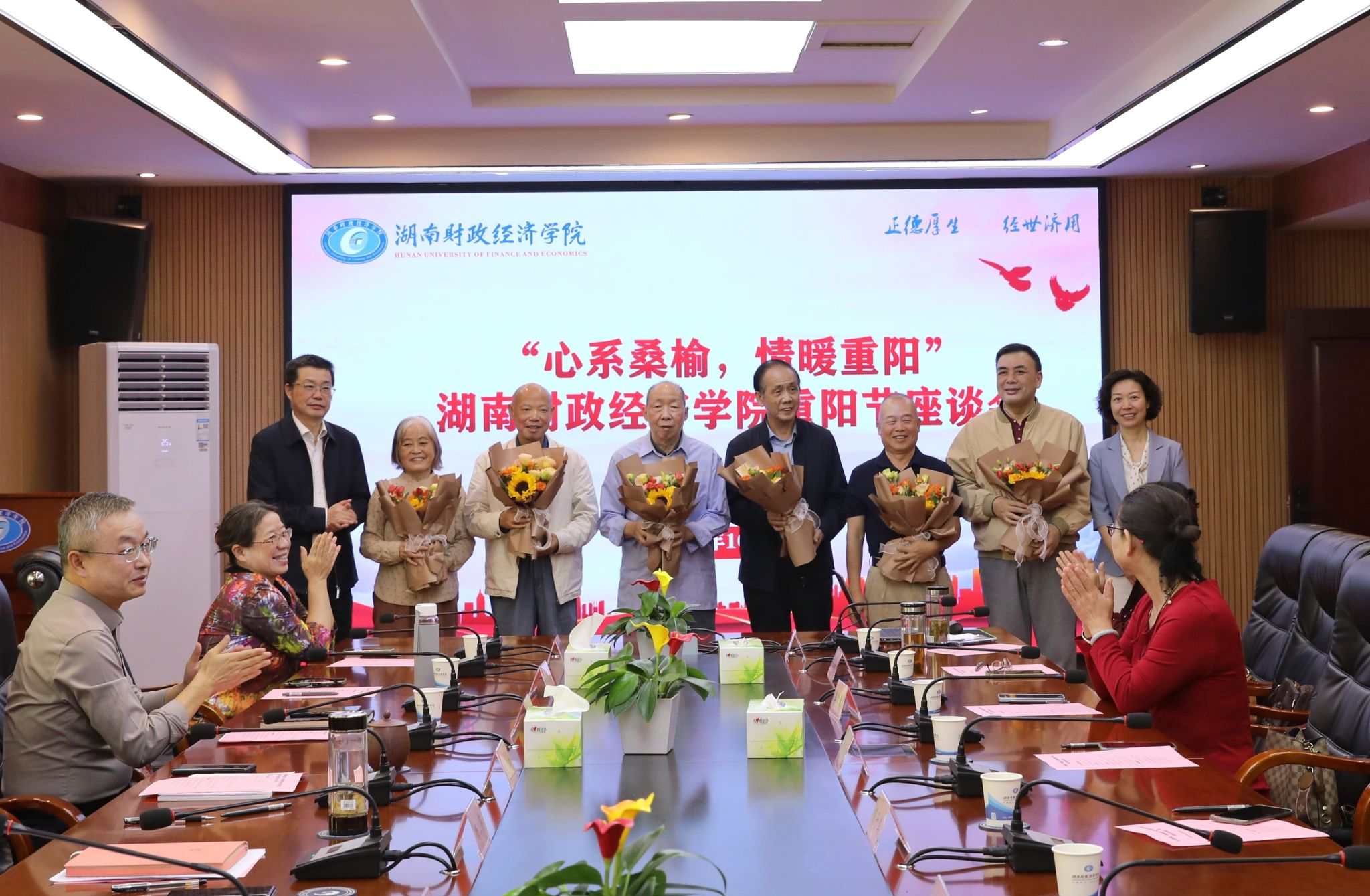 (本网讯)10月11日是中国传统节日“重阳节”,当天上午,学校在办公楼715会议室召开“心系桑榆 情暖重阳”重阳节座谈会,邀请退休老干部、老教师代表欢聚一堂,共贺传统佳节、共叙珍贵情谊、共谋发展新篇。校党委书记杨兰英、校长刘长庚、党委副书记苏玲、副校长刘钟理及相关职能部门负责人参会。苏玲主持会议。学校领导向退休老干部、老教师代表赠送鲜花和贺卡 何妍/摄学生代表朗诵诗歌《莫道桑榆晚,秋日胜春朝》 何妍/摄苏玲主持会议 ...