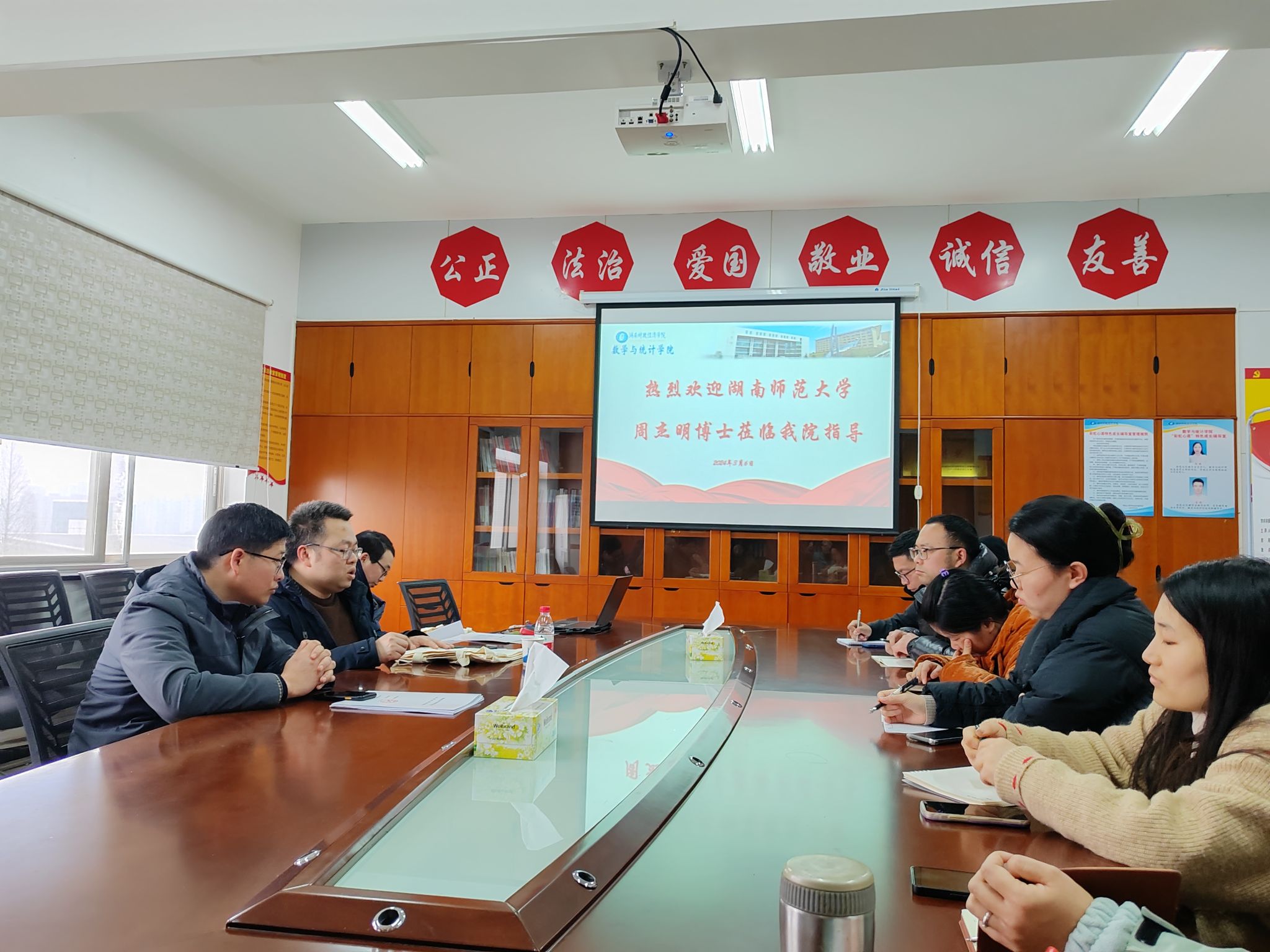 (本网讯)3月6日下午,数学与统计学院在办公楼809会议室召开学科竞赛与本科生人才培养工作会议,湖南师范大学数学与统计学院统计与金融数学系系主任、湖南省统计学会副会长周杰明受邀到会指导。会议由副院长吕胜祥主持,学院全体博士及相关专业老师参加。会议现场周杰明从选题、团队组建、调研过程、调研报告打磨等方面分享了该校全国大学生市场调查大赛参赛经验,建议参赛学生跨学院组队,指导老师跨学科组团,聚焦社会热点选题,...