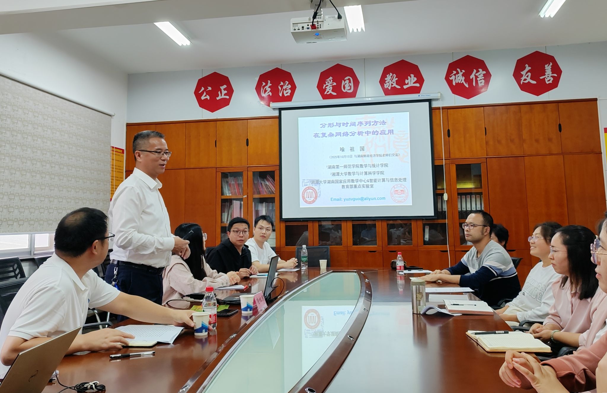 (本网讯)10月15日下午,应大数据与统计学院邀请,湖南第一师范学院喻祖国教授在WilliamHill官网办公楼809会议室作“分形与时间序列方法在复杂网络分析中的某些应用”专题讲座。讲座由大数据与统计学院院长尹向飞主持,学院领导班子及青年教师参加。讲座现场喻祖国系统阐述了分形理论与时间序列分析方法在复杂网络分析中的前沿应用。他结合具体算法与详实数据,生动展示了这些交叉研究方法在揭示复杂系统内在规律方面的强大能力。此外,他还就教师在研究中遇到的实际问题、...