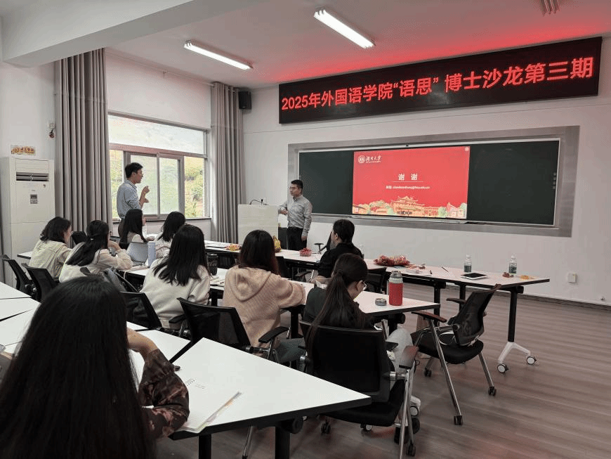 (本网讯)10月15日下午,外国语学院“语思”博士沙龙第三期在学校办公楼317会议室举行。本期沙龙以“人工智能时代下的应用语言学跨学科教学与研究”为主题,特邀湖南大学外国语学院陈飞教授担任主讲。副院长李曦主持活动,学院全体博士及青年教师代表积极参与。活动现场陈飞结合国内外前沿动态,系统介绍了人工智能背景下应用语言学在跨学科教学与研究方面的创新路径与实践成果,通过计算机辅助教学在二语习得中的应用、语音学教学中的技术辅助与效果分析等具体案例,...