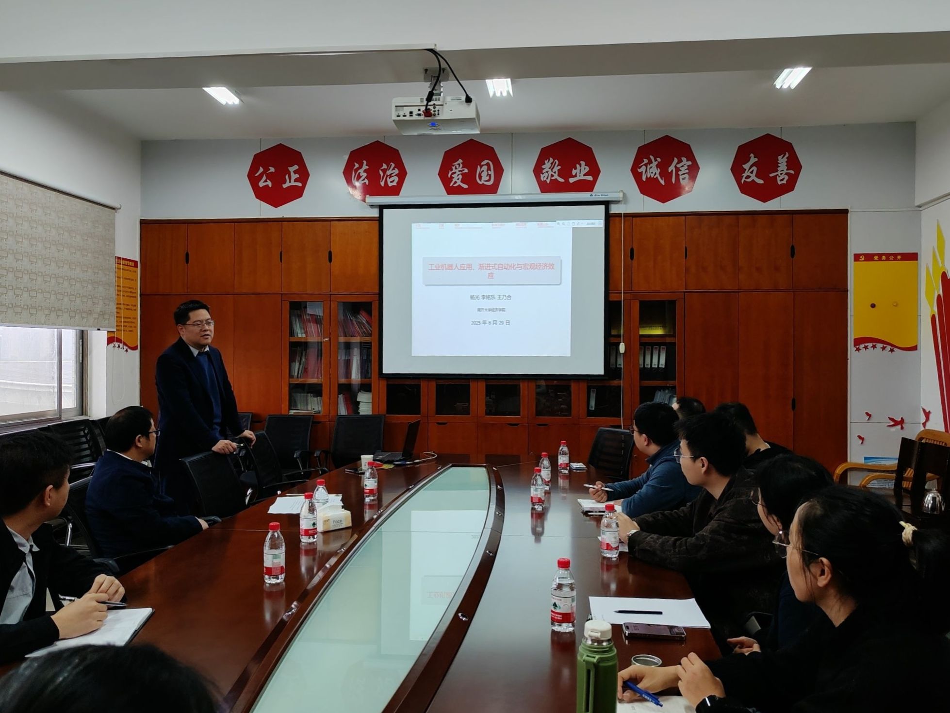 (本网讯)11月8日下午,应大数据与统计学院邀请,南开大学杨光副教授在学校办公楼809会议室作了题为“工业机器人应用、渐进式自动化与宏观经济效应”的学术报告。报告会由院长尹向飞主持,学院领导、青年教师参加会议。报告会现场杨光在报告中从宏观经济学的研究视角出发,通过拓展理论分析框架与建模方法,系统阐述了工业机器人应用与自动化技术发展的相关研究进展。他进一步通过数值模拟与量化分析,评估了机器人效率冲击在宏观经济波动中的影响程度,...