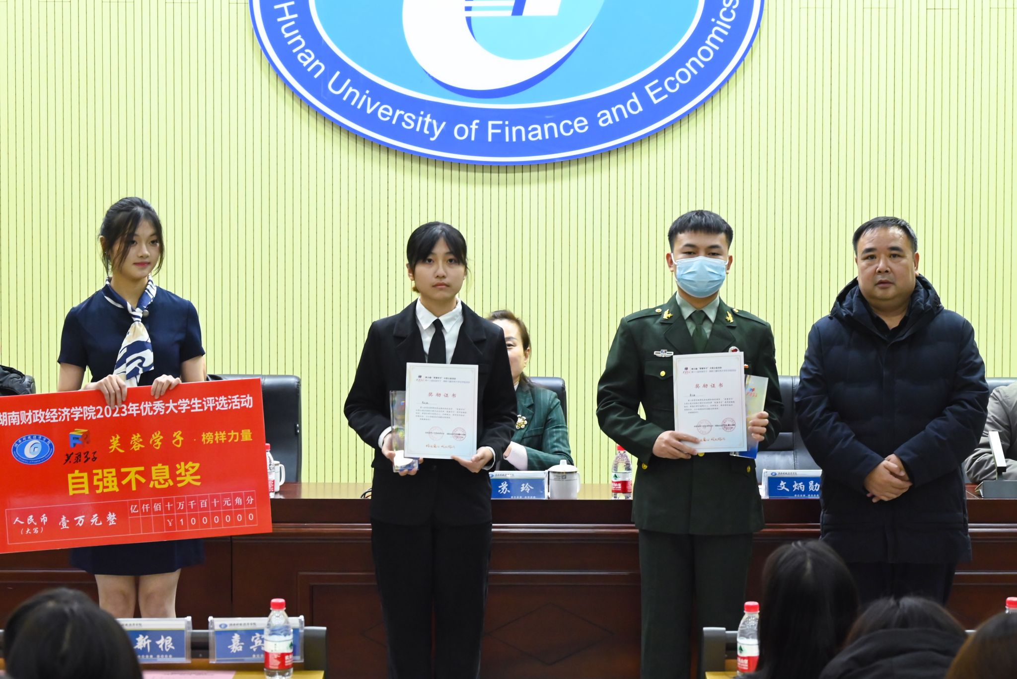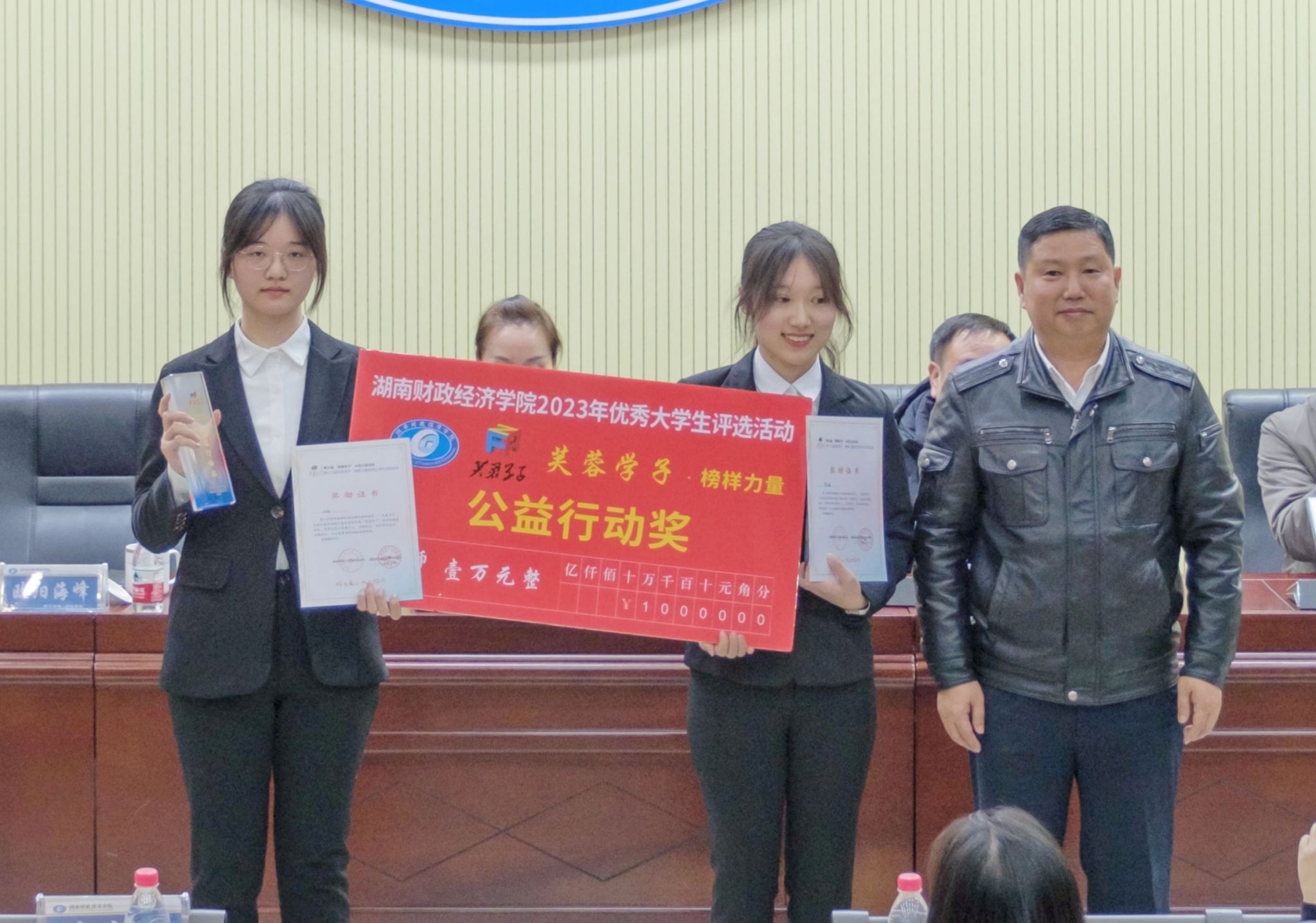 文炳勋宣读了《关于表彰第十八届“芙蓉学子·榜样力量”优秀个人(团队)的决定》。人文与艺术学院赖雨汀和法学与公共管理学院周超荣获芙蓉学子·道德风尚奖,财政金融学院曾依琳和工商管理学院黄关超荣获芙蓉学子·自强不息奖,外国语学院何银和陈宇璐荣获芙蓉学子·公益行动奖,小易志愿服务队和法学与公共管理学院刘清华荣获芙蓉学子·社会实践奖,学术梦之队和亲慕团队荣获芙蓉学子·学术科研奖。