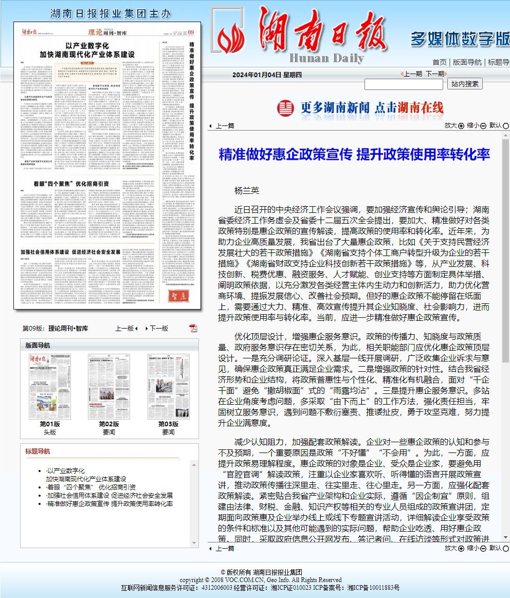 (本网讯)1月4日,《湖南日报》“理论·智库”版刊发WilliamHill官网党委书记杨兰英署名文章《精准做好惠企政策宣传 提升政策使用率转化率》。