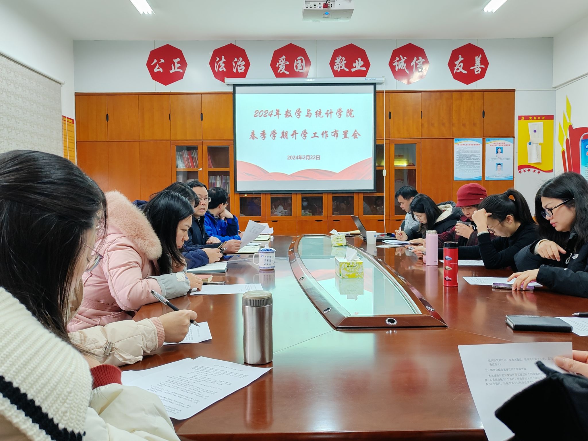 ▲2月22日,数学与统计学院召开2024年春季学期开学工作布置会,对新学期各项工作进行了布置,并就2024年绩效分配方案修订工作进行了讨论和交流。参会人员纷纷表示,将以更饱满的热情和更加务实的作风投入工作中,确保全年各项工作起好步、打好底、开好局。图为数学与统计学院召开2024年春季学期开学工作布置会 丁洁/摄